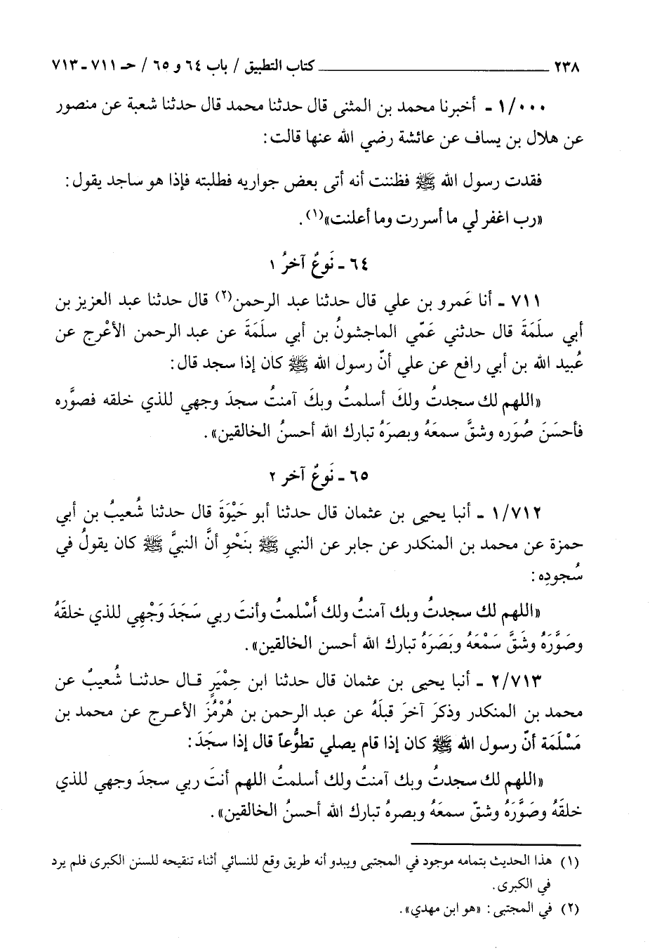 711 - أنا عمرو بن علي قال حدثنا عبد الرحمن قال حدثنا عبد العزيز بن أبي سلمة قال حدثني عمي الماجشون بن أبي سلمة عن عبد الرحمن الأعرج عن عبيد الله بن أبي رافع عن علي : أن رسول الله صلى الله عليه و سلم كان إذا سجد قال اللهم لك سجدت ولك أسلمت وبك آمنت سجد وجهي للذي خلقه فصوره فأحسن صوره وشق سمعه وبصره تبارك الله أحسن الخالقين