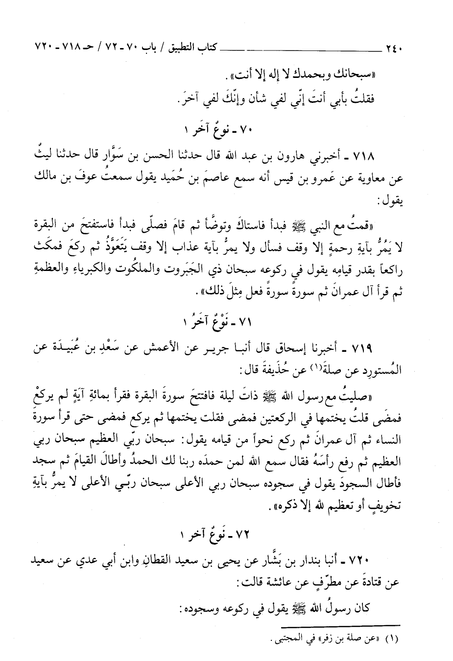 719 - أخبرنا إسحاق قال أنبأ جرير عن الأعمش عن سعد بن عبيدة عن المستورد عن صلة عن حذيفة قال : صليت مع رسول الله صلى الله عليه و سلم ذات ليلة فافتتح سورة البقرة فقرأ بمائة آية لم يركع فمضى قلت يختمها في الركعتين فمضى فقلت يختمها ثم يركع فمضى حتى قرأ سورة النساء ثم آل عمران ثم ركع نحوا من قيامه يقول سبحان ربي العظيم سبحان ربي العظيم ثم رفع رأسه فقال سمع الله لمن حمده ربنا لك الحمد وأطال القيام ثم سجد فأطال السجود يقول في سجوده سبحان ربي الأعلى سبحان ربي الأعلى لا يمر بآية تخويف أو تعظيم لله إلا ذكره