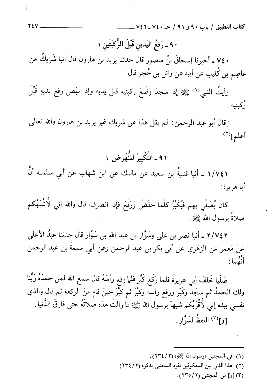 740 - أخبرنا إسحاق بن منصور قال حدثنا يزيد بن هارون قال أنبأ شريك عن عاصم بن كليب عن أبيه عن وائل بن حجر قال : رأيت النبي صلى الله عليه و سلم إذا سجد وضع ركبتيه قبل يديه وإذا نهض رفع يديه قبل ركبتيه قال أبو عبد الرحمن لم يقل هذا عن شريك غير يزيد بن هارون والله تعالى أعلم