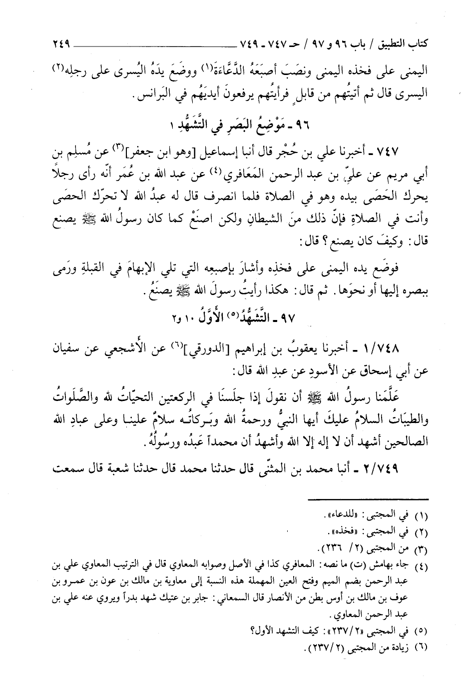 747 - أخبرنا علي بن حجر قال أنبأ إسماعيل وهو بن جعفر عن مسلم بن أبي مريم عن علي بن عبد الرحمن المعافري عن عبد الله عن عمر : أنه رأى رجلا يحرك الحصى بيده وهو في الصلاة فلما انصرف قال له عبد الله لا تحرك الحصى وأنت في الصلاة فإن ذلك من الشيطان ولكن اصنع كما كان رسول الله صلى الله عليه و سلم يصنع قال وكيف كان يصنع قال فوضع يده اليمنى على فخذه وأشار بإصبعه التي تلي الإبهام في القبلة ورمى ببصره إليه أو نحوها ثم قال هكذا رأيت رسول الله صلى الله عليه و سلم يصنع