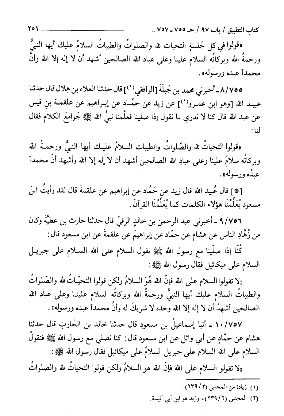 755 - أخبرني محمد بن جبلة الرافقي قال حدثنا العلاء بن هلال قال حدثنا عبيد الله وهو بن عمرو عن زيد عن حماد عن إبراهيم عن علقمة بن قيس عن عبد الله قال : كنا لا ندري ما نقول إذا صلينا فعلمنا نبي الله صلى الله عليه و سلم جوامع الكلام فقال لنا قولوا التحيات لله والصلوات والطيبات السلام عليك أيها النبي ورحمة الله وبركاته سلام علينا وعلى عباد الله الصالحين أشهد أن لا إله إلا الله وأشهد أن محمدا عبده ورسوله قال عبيد الله قال زيد عن حماد عن إبراهيم عن علقمة قال لقد رأيت بن مسعود يعلمنا هؤلاء الكلمات كما يعلمنا القرآن