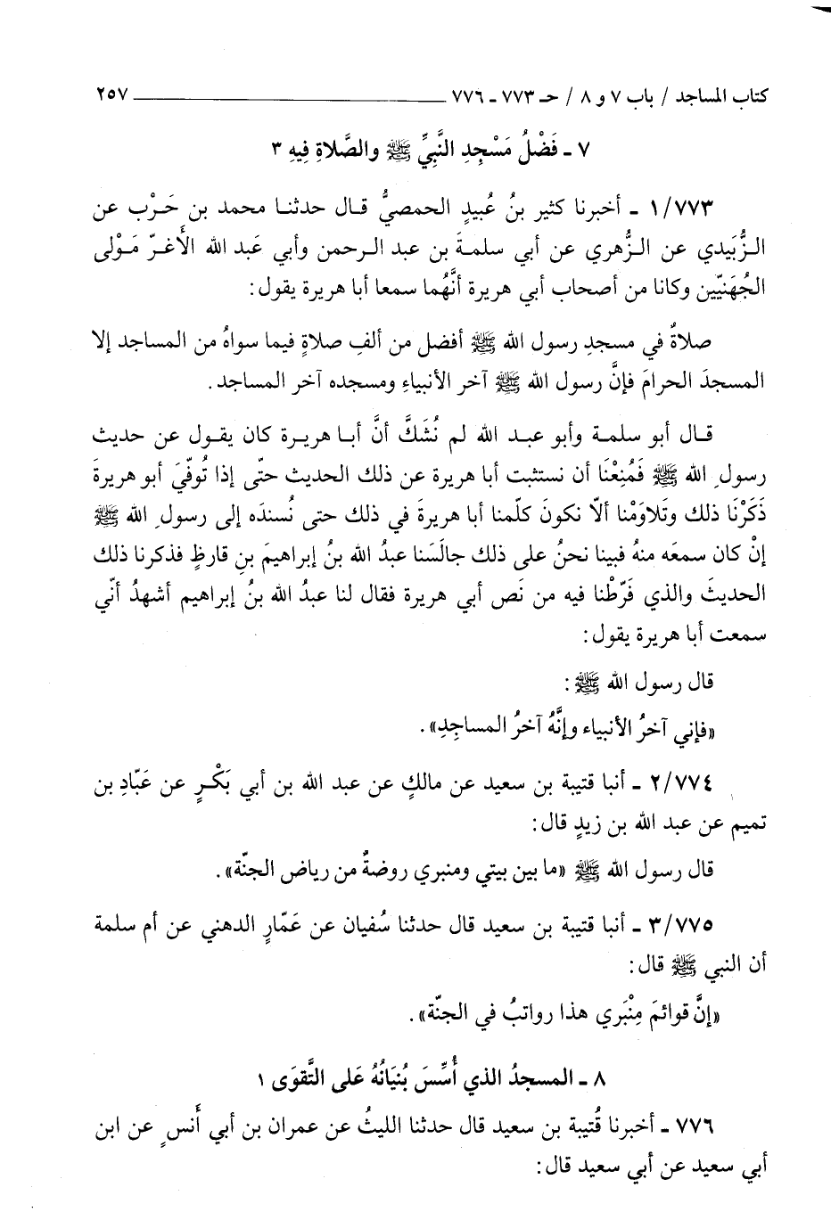 773 - أخبرنا كثير بن عبيد الحمصي قال حدثنا محمد بن حرب عن الزبيدي عن الزهري عن أبي سلمة بن عبد الرحمن وأبي عبد الله الأغر مولى الجهنيين وكانا من أصحاب أبي هريرة أنهما سمعا أبا هريرة يقول : صلاة في مسجد رسول الله صلى الله عليه و سلم أفضل من ألف صلاة فيما سواه من المساجد إلا المسجد الحرام فإن رسول الله صلى الله عليه و سلم آخر الأنبياء ومسجده آخر المساجد قال أبو سلمة وأبو عبد الله لم نشك أن أبا هريرة كان يقول عن حديث رسول الله صلى الله عليه و سلم فمنعنا أن نستثبت أبا هريرة عن ذلك الحديث حتى إذا توفي أبو هريرة ذكرنا ذلك وتلاومنا ألا نكون كلمنا أبا هريرة في ذلك حتى نسنده إلى رسول الله صلى الله عليه و سلم إن كان سمعه منه فبينا نحن على ذلك جالسنا عبد الله بن إبراهيم بن قارظ فذكرنا ذلك الحديث والذي فرطنا فيه من نص أبي هريرة فقال لنا عبد الله بن إبراهيم أشهد أني سمعت أبا هريرة يقول قال رسول الله صلى الله عليه و سلم فإني آخر الأنبياء وإنه آخر المساجد