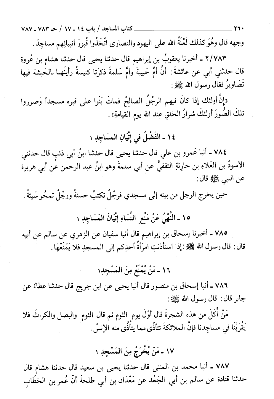783 - أخبرنا يعقوب بن إبراهيم قال حدثنا يحيى قال حدثنا هشام بن عروة قال حدثني أبي عن عائشة أن أم حبيبة وأم سلمة ذكرتا كنيسة رأينها بالحبشة فيها تصاوير فقال رسول الله صلى الله عليه و سلم : إن أولئك إذا كان فيهم الرجل الصالح فمات بنوا على قبره مسجدا وصوروا تلك الصور أولئك شرار الخلق عند الله يوم القيامة