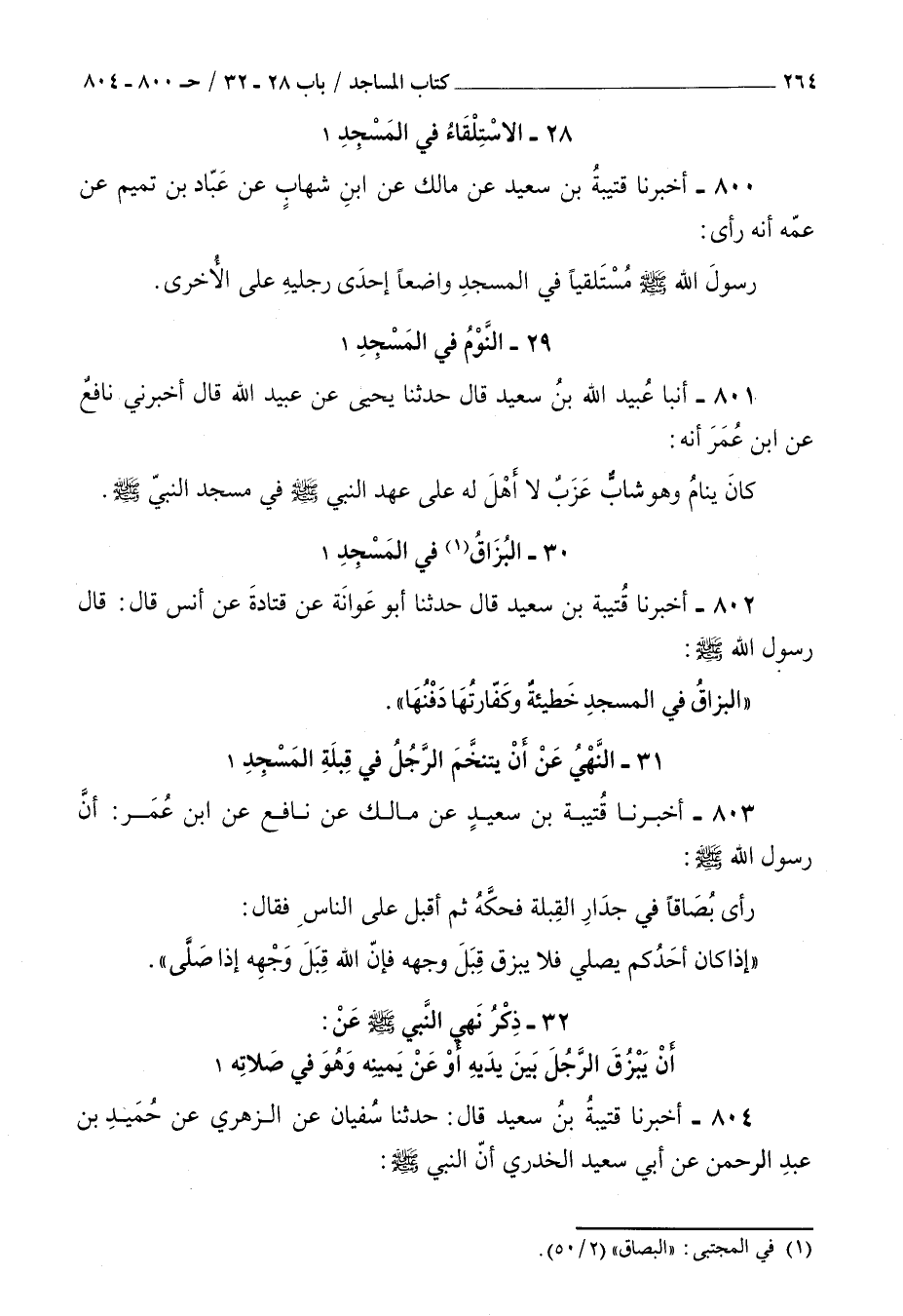 802 - أخبرنا قتيبة بن سعيد قال حدثنا أبو عوانة عن قتادة عن أنس قال قال رسول الله صلى الله عليه و سلم : البزاق في المسجد خطيئة وكفارتها دفنها