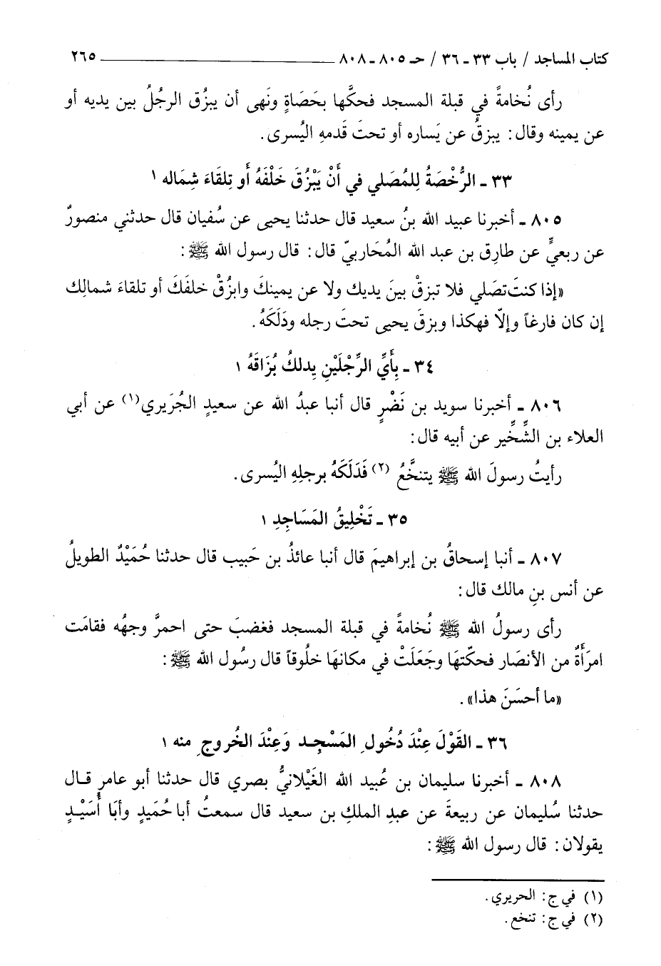 806 - أخبرنا سويد بن نضر قال أنبأ عبد الله عن سعيد الجريري عن أبي العلاء بن الشخير عن أبيه قال : رأيت رسول الله صلى الله عليه و سلم يتنخع فدلكه برجله اليسرى