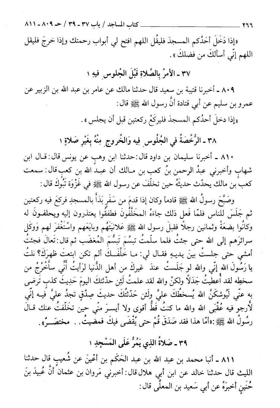 809 - أخبرنا قتيبة بن سعيد قال حدثنا مالك عن عامر بن عبد الله بن الزبير عن عمرو بن سليم عن أبي قتادة أن رسول الله صلى الله عليه و سلم قال : إذا دخل أحدكم المسجد فليركع ركعتين قبل أن يجلس
