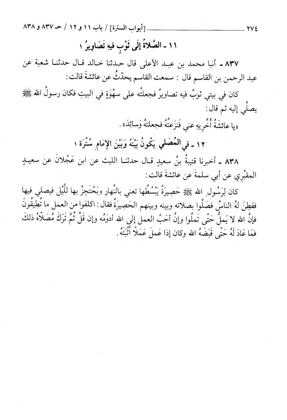 837 - أنبأ محمد بن عبد الأعلى قال حدثنا خالد قال حدثنا شعبة عن عبد الرحمن بن القاسم قال سمعت القاسم يحدث عن عائشة قالت : كان في بيتي ثوب فيه تصاوير فجعلته على سهوة في البيت فكان رسول الله صلى الله عليه و سلم يصلي إليه ثم قال يا عائشة أخريه عني فنزعته فجعلته وسائد