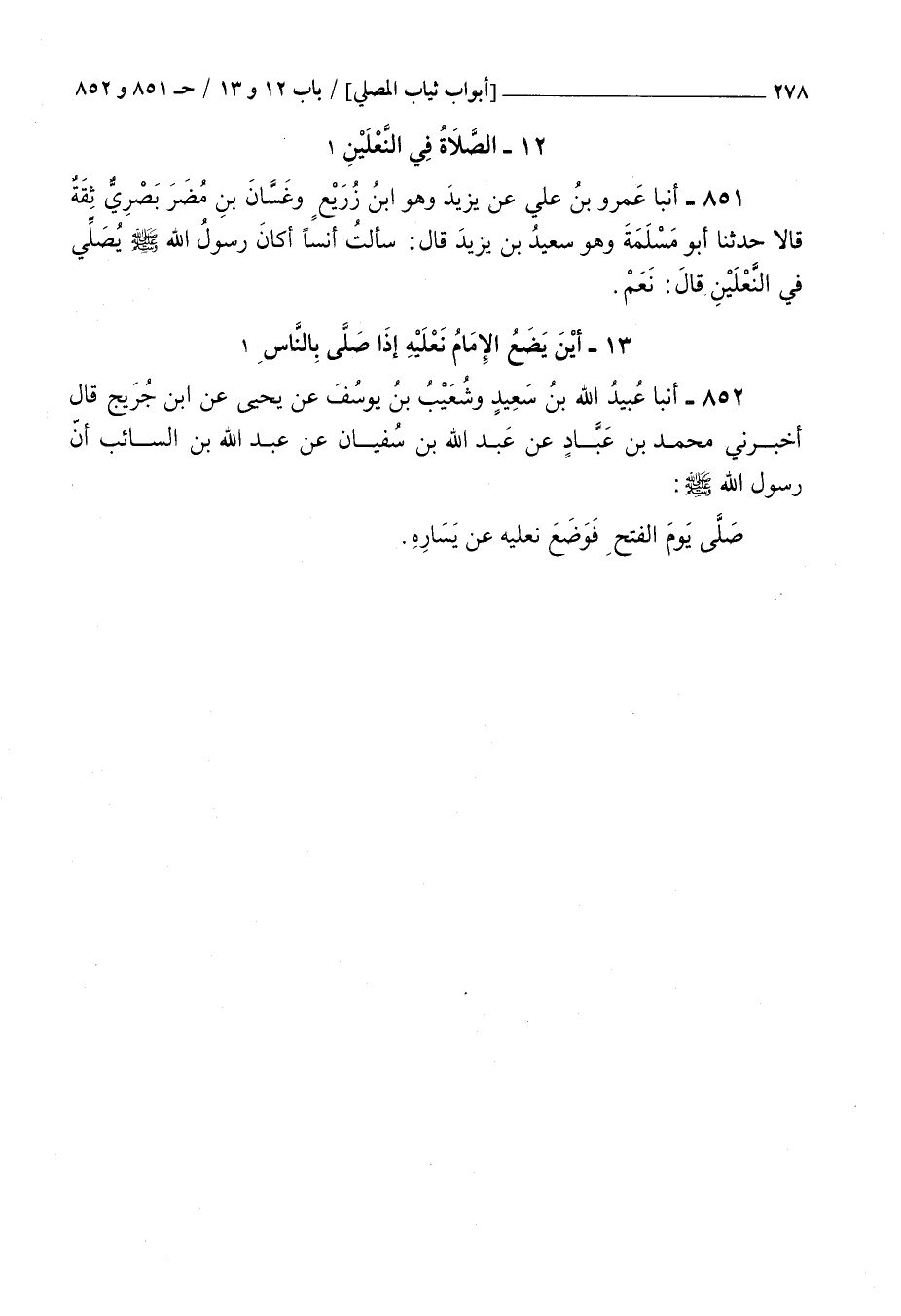 851 - أنبأ عمرو بن علي عن يزيد وهو بن زريع وغسان بن مضر بصري ثقة قالا حدثنا أبو مسلمة وهو سعيد بن يزيد قال : سألت أنسا أكان رسول الله صلى الله عليه و سلم يصلي في النعلين قال نعم
