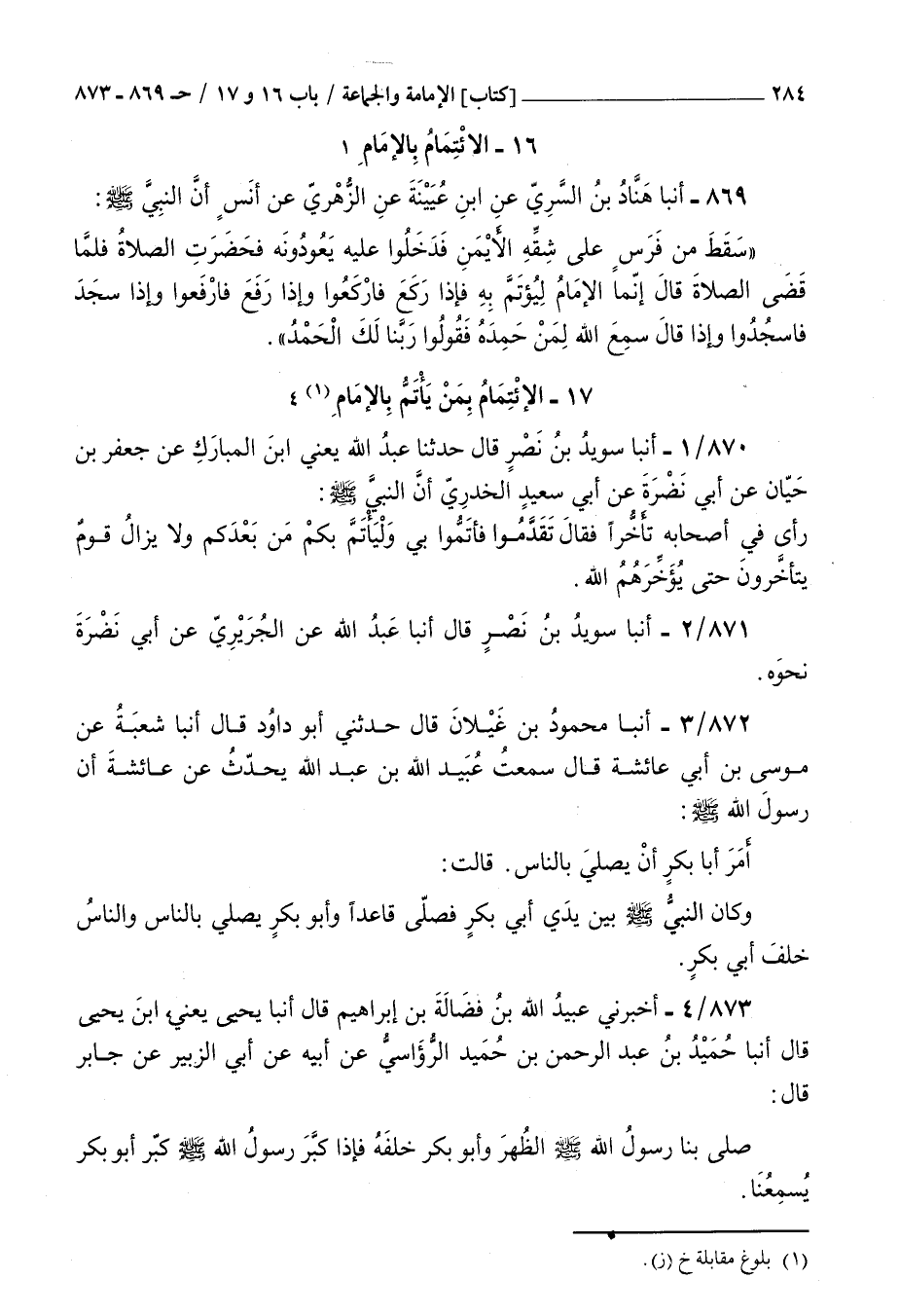 869 - أنبأ هناد بن السري عن بن عيينة عن الزهري عن أنس : أن النبي صلى الله عليه و سلم سقط من فرس على شقه الأيمن فدخلوا عليه يعودونه فحضرت الصلاة فلما قضى الصلاة قال إنما الإمام ليؤتم به فإذا ركع فاركعوا وإذا رفع فارفعوا وإذا سجد فاسجدوا وإذا قال سمع الله لمن حمده فقولوا ربنا لك الحمد