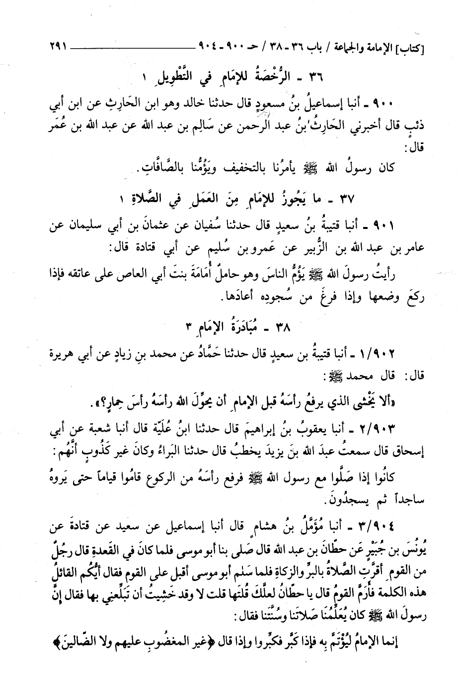 902 - أنبأ قتيبة بن سعيد قال حدثنا حماد عن محمد بن زياد عن أبي هريرة قال قال محمد صلى الله عليه و سلم : ألا يخشى الذي يرفع رأسه قبل الإمام أن يحول الله رأسه رأس حمار