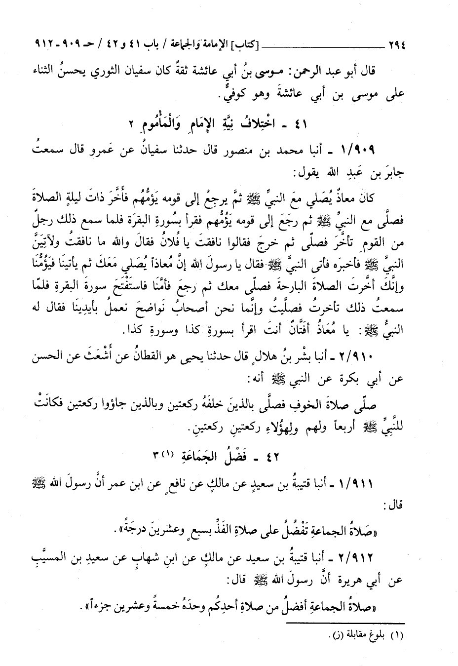 911 - أنبأ قتيبة بن سعيد عن مالك عن نفع عن بن عمر أن رسول الله صلى الله عليه و سلم قال : صلاة الجماعة تفضل على صلاة الفذ بسبع وعشرين درجة