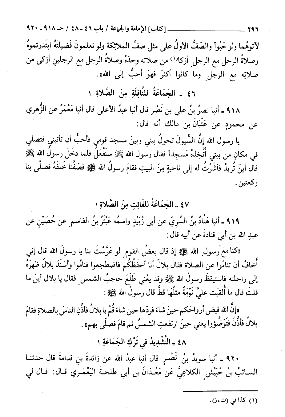 920 - أنبأ سويد بن نصر قال أنبأ عبد الله عن زائدة بن قدامة قال حدثنا السائب بن حبيش الكلاعي عن معدان بن أبي طلحة اليعمري قال قال لي أبو الدرداء أين مسكنك فقلت في قرية دوين حمص فقال أبو الدرداء سمعت رسول الله صلى الله عليه و سلم يقول : ما من ثلاثة في قرية ولا بدو لا تقام فيهم الصلاة إلا قد استحوذ عليهم الشيطان فعليك بالجماعة فإنما يأكل الذئب القاصية قال السائب يعني بالجماعة الجماعة في الصلاة
