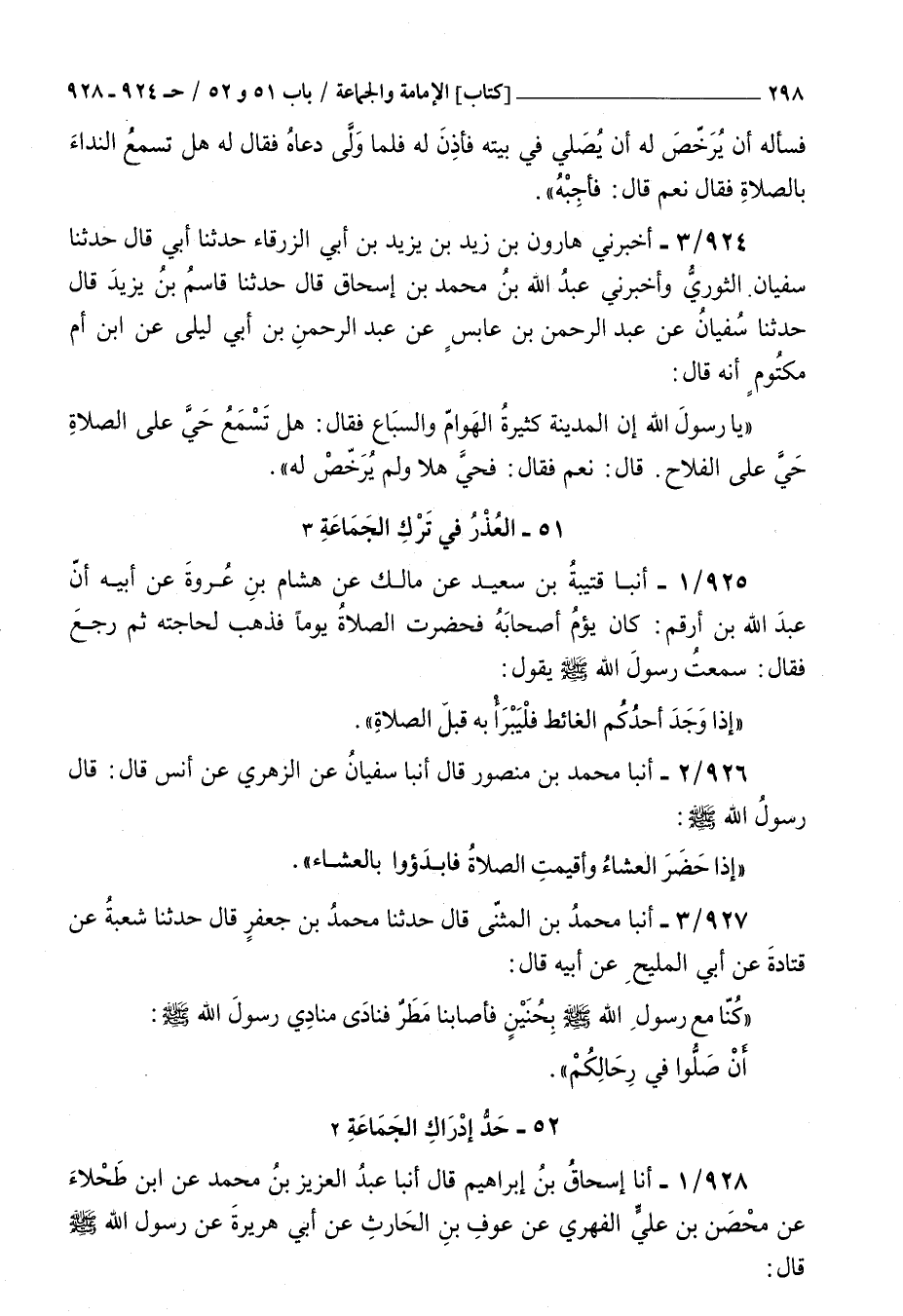 924 - أخبرني هارون بن زيد بن يزيد بن أبي الزرقاء حدثنا أبي قال حدثنا سفيان الثوري وأخبرني عبد الله بن محمد بن إسحاق قال حدثنا قاسم بن يزيد قال حدثنا سفيان عن عبد الرحمن بن عابس عن عبد الرحمن بن أبي ليلى عن بن أم مكتوم قال : يا رسول الله إن المدينة كثيرة الهوام والسباع فقال هل تسمع حي على الصلاة حي على الفلاح قال نعم فقال فحي هلا ولم يرخص له