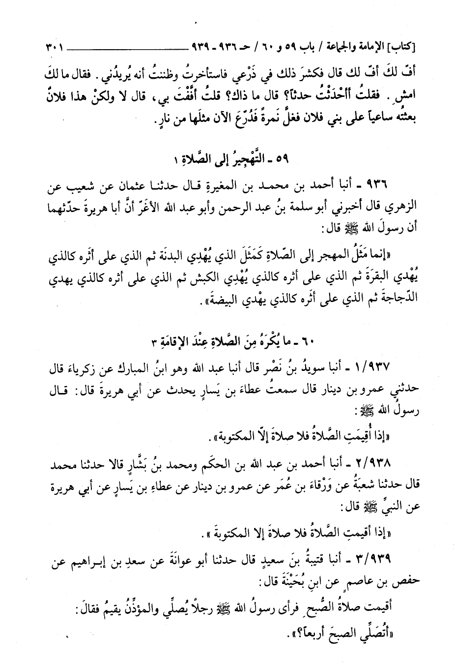 936 - أنبأ أحمد بن محمد بن المغيرة قال حدثنا عثمان بن شعيب عن الزهري قال أخبرني أبو سلمة بن عبد الرحمن وأبو عبد الله الأغر أن أبا هريرة حدثهما أن رسول الله صلى الله عليه و سلم قال : إنما مثل المهجر إلى الصلاة كمثل الذي يهدي البدنة ثم الذي على أثره كالذي يهدي البقرة ثم الذي على أثره كالذي يهدي الكبش ثم الذي على أثره كالذي يهدي الدجاجة ثم الذي على أثره كالذي يهدي البيضة