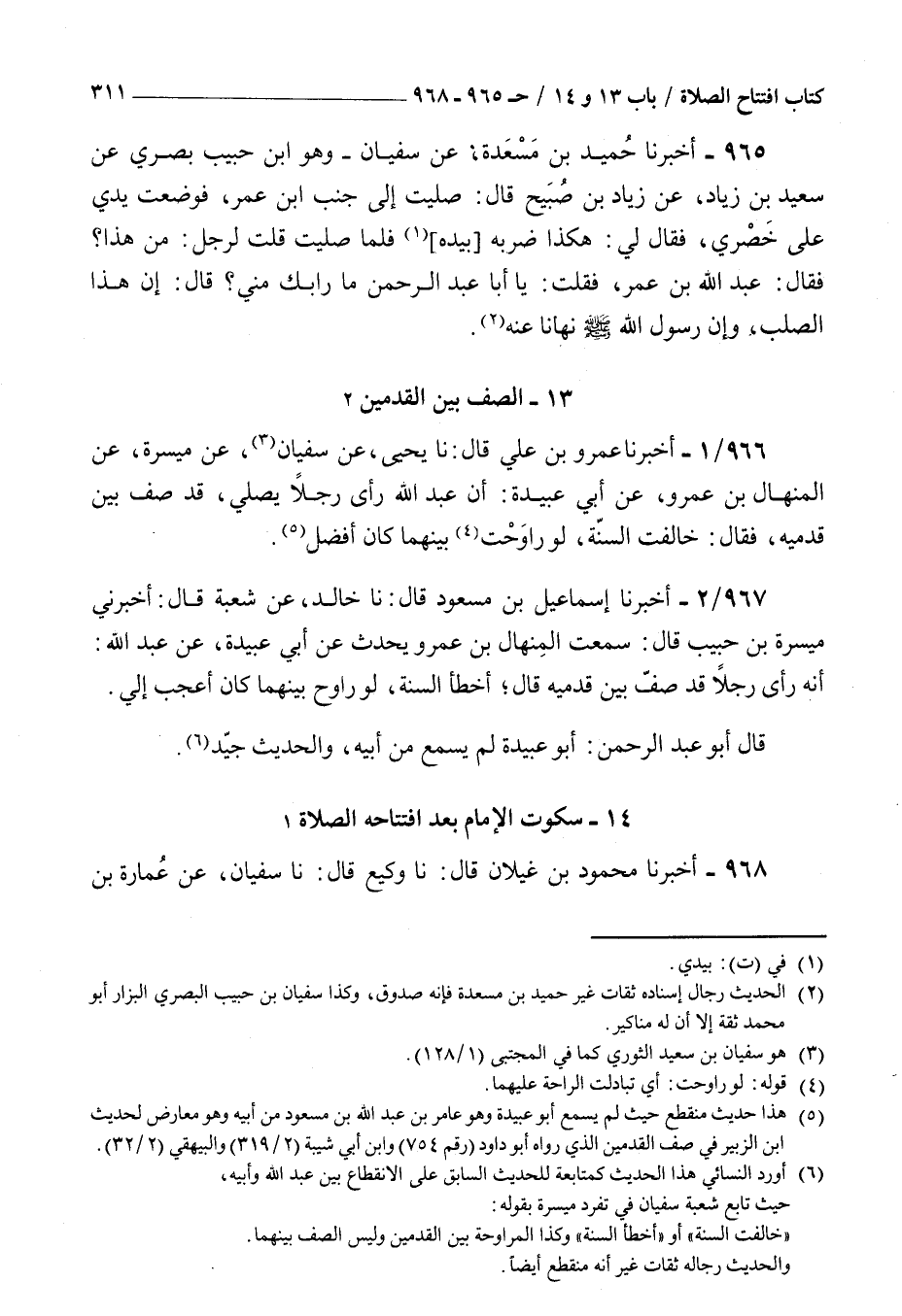 967 - أخبرنا إسماعيل بن مسعود قال نا خالد عن شعبة قال أخبرني ميسرة بن حبيب قال سمعت المنهال بن عمرو يحدث عن أبي عبيدة عن عبد الله : أنه رأى رجلا قد صف بين قدميه قال أخطأ السنة لو راوح بينهما كان أعجب إلي قال أبو عبد الرحمن أبو عبيدة لم يسمع من أبيه والحديث جيد