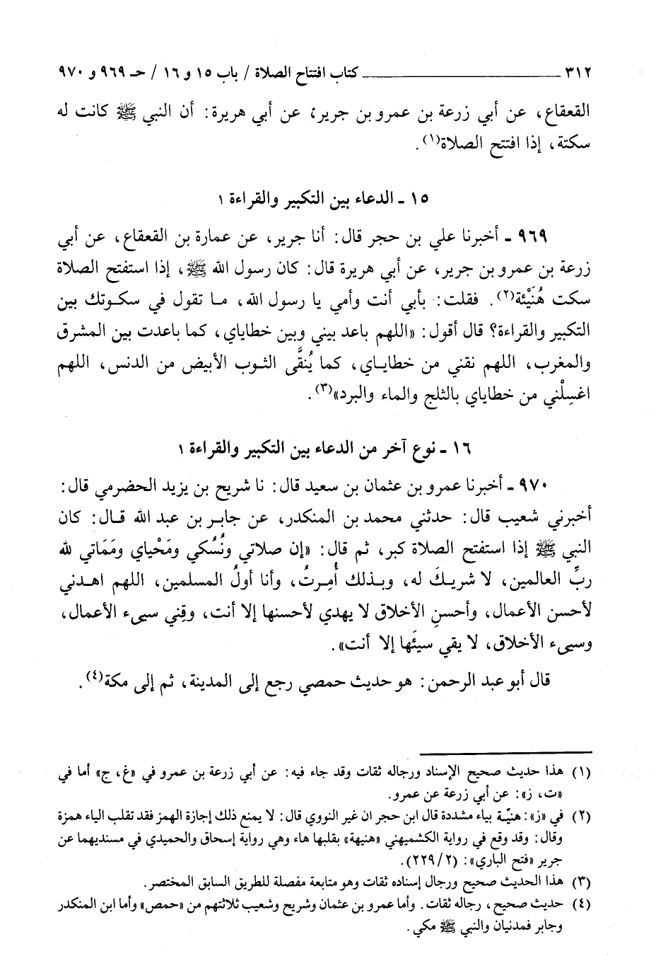 970 - أخبرنا عمرو بن عثمان بن سعيد قال نا شريح بن يزيد الحضرمي قال أخبرني شعيب قال حدثني محمد بن المنكدر عن جابر بن عبد الله قال : كان النبي صلى الله عليه و سلم إذا استفتح الصلاة كبر ثم قال إن صلاتي ونسكي ومحياي ومماتي لله رب العالمين لا شريك له وبذلك أمرت وأنا أول المسلمين اللهم اهدني لأحسن الأعمال وأحسن الأخلاق لا يهدي لأحسنها إلا أنت وقني سيء الأعمال وسيء الأخلاق لا يقي سيئها إلا أنت قال أبو عبد الرحمن هو حديث حمصي رجع إلى المدينة ثم إلى مكة