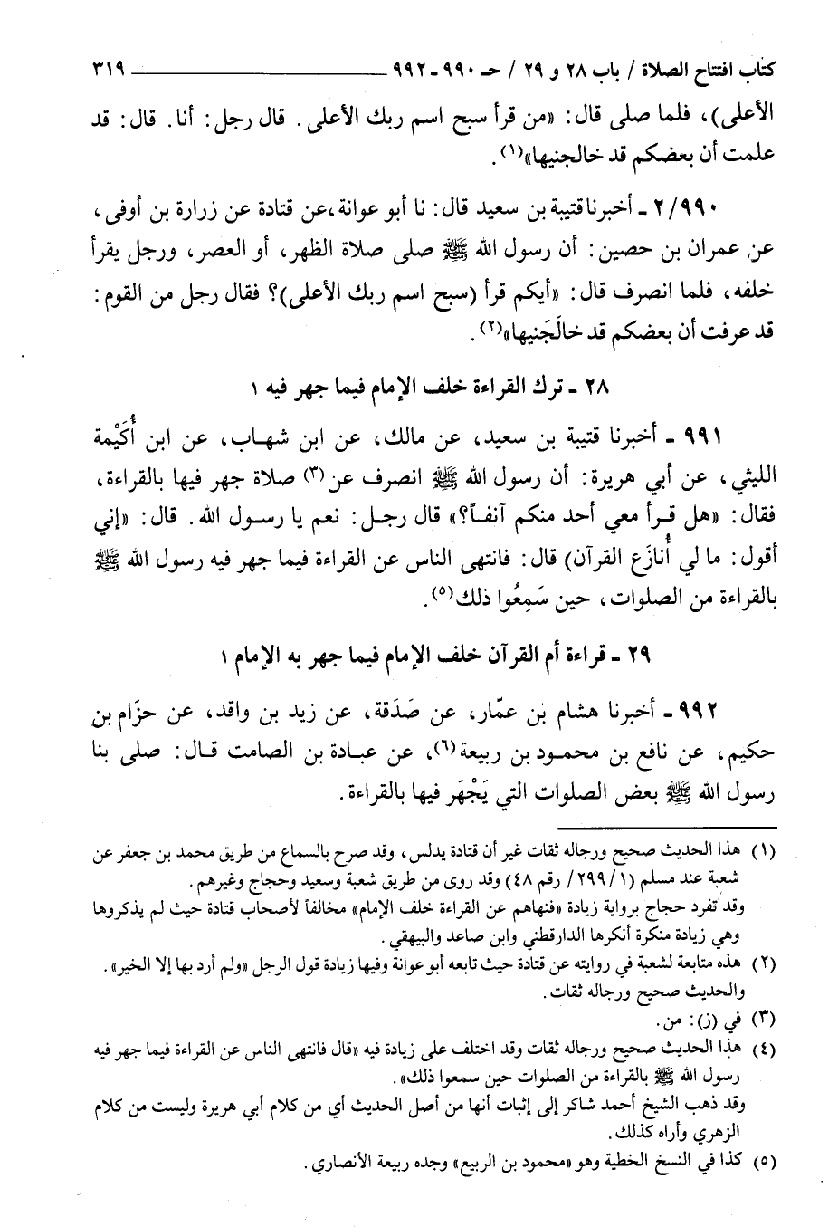 992 - أخبرنا هشام بن عمار عن صدقة عن زيد بن واقد عن حزام بن حكيم عن نافع بن محمود بن ربيعة عن عبادة بن الصامت قال : صلى بنا رسول الله صلى الله عليه و سلم بعض الصلوات التي يجهر فيها بالقراءة قال لا يقرأن أحد منكم إذا جهرت بالقراءة إلا بأم القرآن