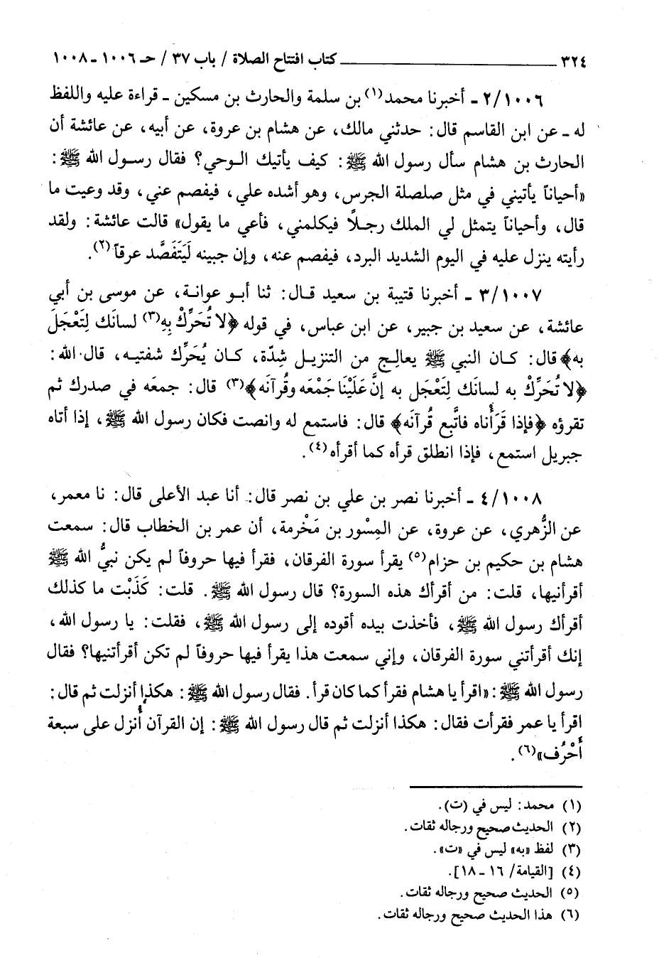 1007 - أخبرنا قتيبة بن سعيد قال ثنا أبو عوانة عن موسى بن أبي عائشة عن سعيد بن جبير عن بن عباس في قوله { لا تحرك به لسانك لتعجل به } قال : كان النبي صلى الله عليه و سلم يعالج من التنزيل شدة كان يحرك شفتيه قال الله { لا تحرك به لسانك لتعجل به إن علينا جمعه وقرآنه } قال جمعه في صدرك ثم تقرؤه فإذا قرأناه فاتبع قرآنه قال فاستمع له وأنصت فكان رسول الله صلى الله عليه و سلم إذا أتاه جبريل استمع فإذا انطلق قرأه كما أقرأه