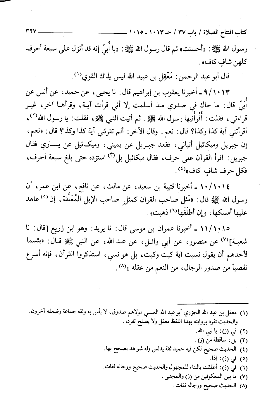 1013 - أخبرنا يعقوب بن إبراهيم قال نا يحيى عن حميد عن أنس عن أبي قال : ما حاك في صدري منذ أسلمت إلا أني قرأت آية وقرأها آخر غير قراءتي فقلت أقرأنيها رسول الله صلى الله عليه و سلم ثم أتيت النبي صلى الله عليه و سلم فقلت يا رسول الله أقرأتني آية كذا وكذا قال نعم وقال الآخر ألم تقرئني آية كذا وكذا قال نعم إن جبريل وميكائيل أتياني فقعد جبريل عن يميني وميكائيل عن يساري فقال جبريل اقرأ القرآن على حرف فقال ميكائيل بل استزده حتى بلغ سبعة أحرف فكل حرف شاف كاف