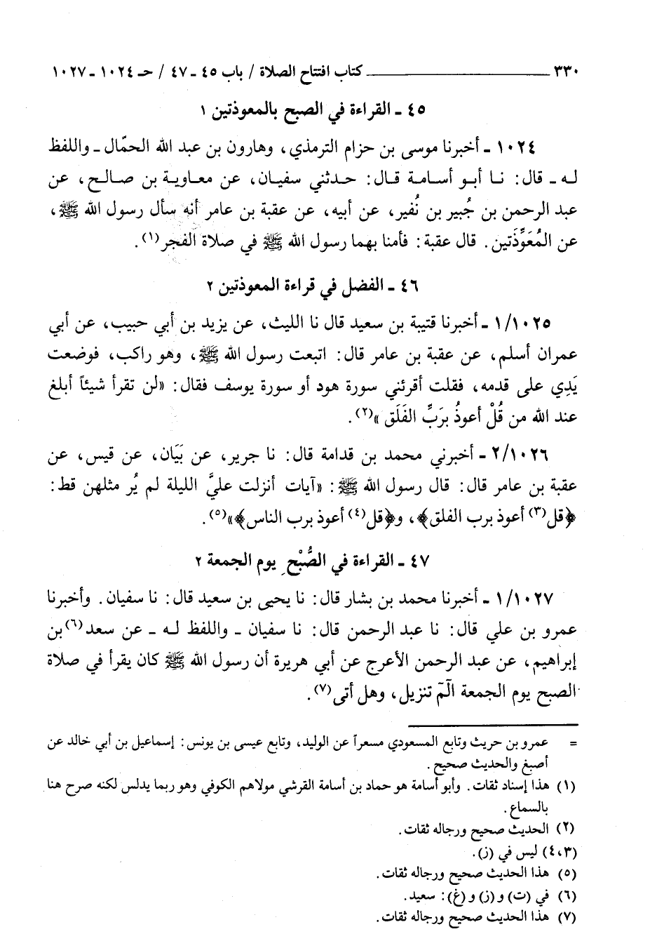 1024 - أخبرنا موسى بن حزام الترمذي وهارون بن عبد الله الحمال واللفظ له قال نا أبو أسامة قال حدثني سفيان عن معاوية بن صالح عن عبد الرحمن بن جبير بن نفير عن أبيه عن عقبة بن عامر : أنه سأل رسول الله صلى الله عليه و سلم عن المعوذتين قال عقبة فأمنا بهما رسول الله صلى الله عليه و سلم في صلاة الفجر
