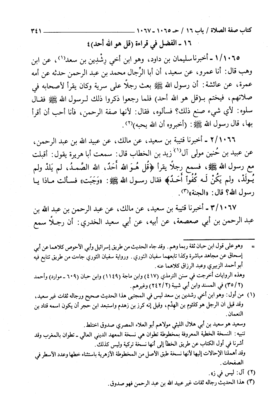 1065 - أخبرنا سليمان بن داود وهو بن أخي رشدين بن سعد عن بن وهب قال أنا عمرو عن سعيد أن أبا الرجال محمد بن عبد الرحمن حدثه عن أمه عمرة عن عائشة : أن رسول الله صلى الله عليه و سلم بعث رجلا على سرية وكان يقرأ لأصحابه في صلاتهم فيختم ب قل هو الله أحد فلما رجعوا ذكروا ذلك لرسول الله صلى الله عليه و سلم فقال سلوه لأي شيء صنع ذلك فسألوه فقال لأنها صفة الرحمن فأنا أحب أن أقرأ بها قال رسول الله صلى الله عليه و سلم أخبروه أن الله يحبه