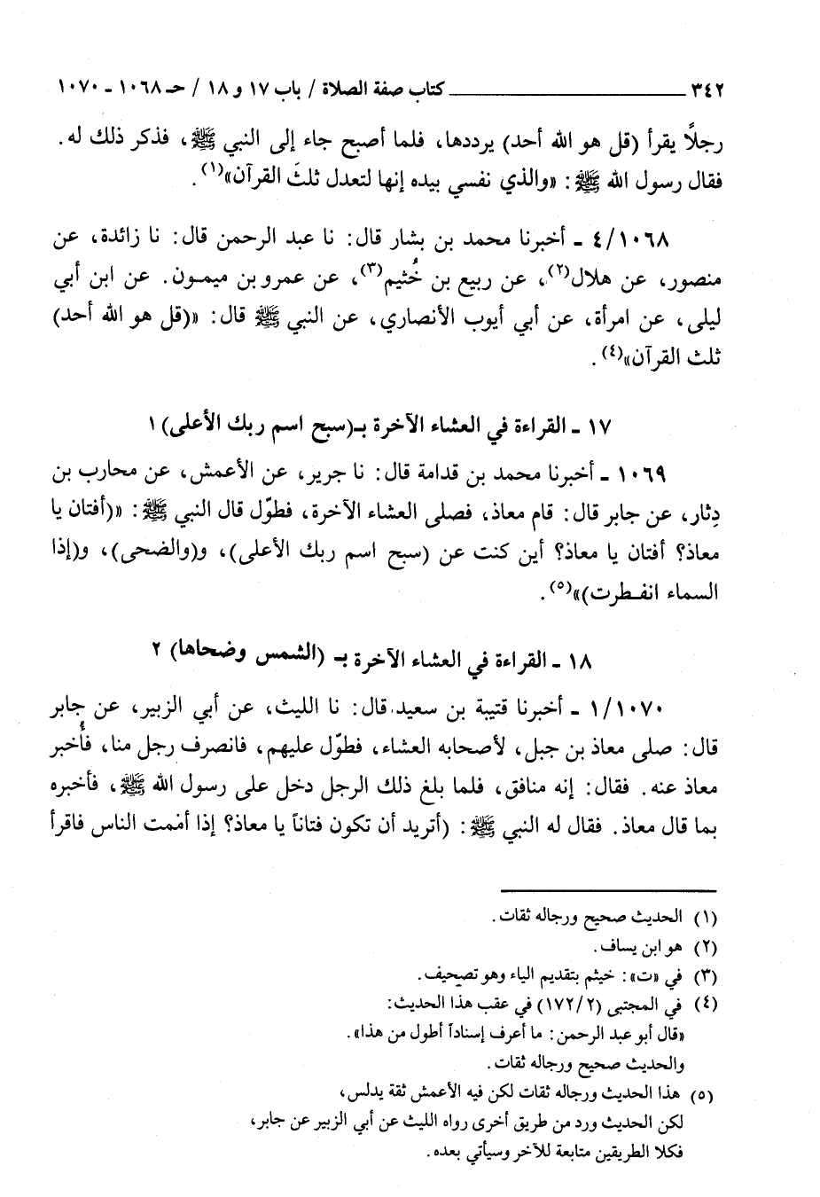 1070 - أخبرنا قتيبة بن سعيد قال نا الليث عن أبي الزبير عن جابر قال : صلى معاذ بن جبل لأصحابه العشاء فطول عليهم فانصرف رجل منا فأخبر معاذ عنه فقال إنه منافق فلما بلغ ذلك الرجل دخل على رسول الله صلى الله عليه و سلم فأخبره بما قال معاذ فقال له النبي صلى الله عليه و سلم أتريد أن تكون فتانا يا معاذ إذا أممت الناس فاقرأ ب الشمس وضحاها و سبح اسم ربك الأعلى والليل إذا يغشى واقرأ باسم ربك