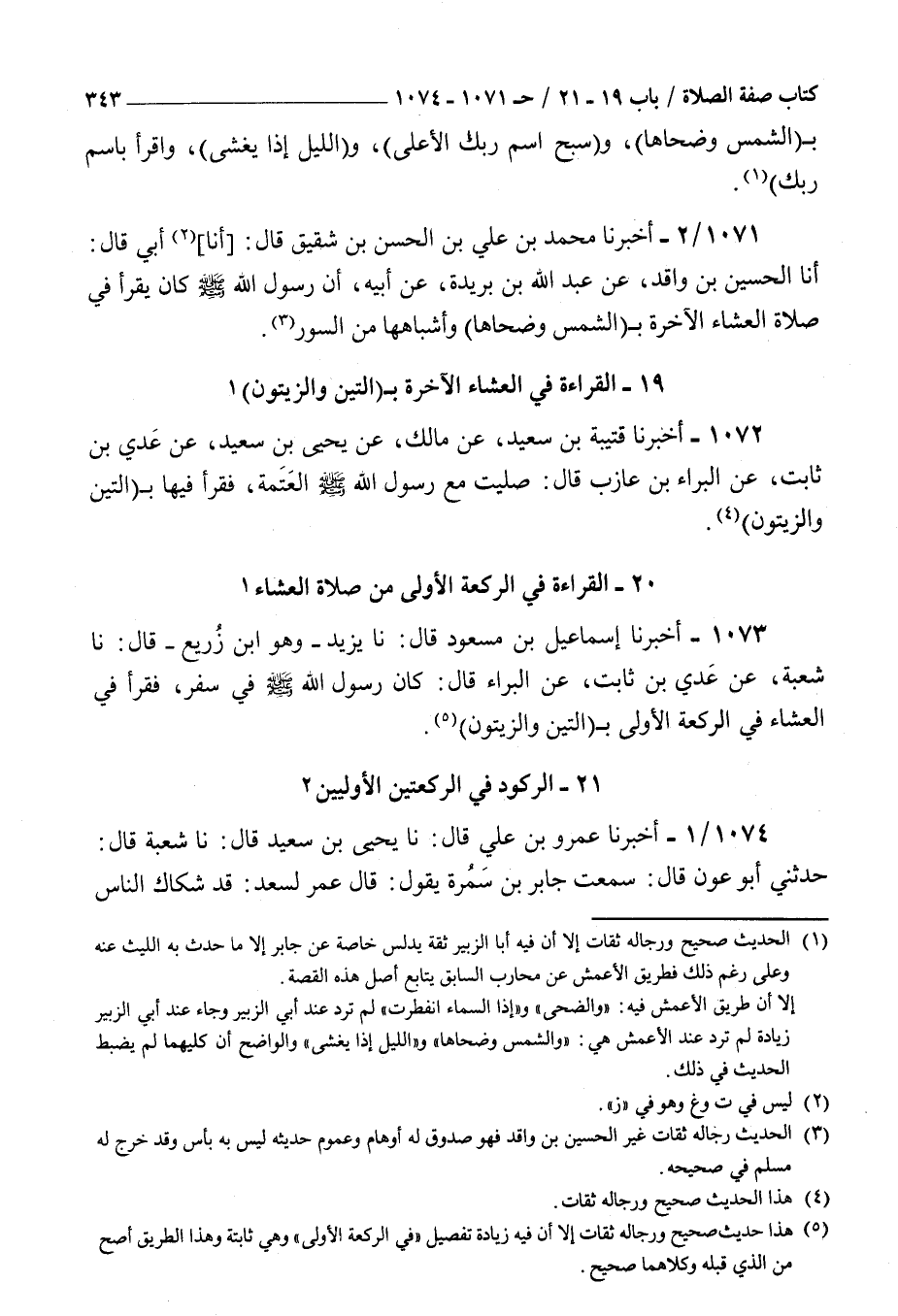 1073 - أخبرنا إسماعيل بن مسعود قال نا يزيد وهو بن زريع قال نا شعبة عن عدي بن ثابت عن البراء قال : كان رسول الله صلى الله عليه و سلم في سفر فقرأ في العشاء في الركعة الأولى ب التين والزيتون