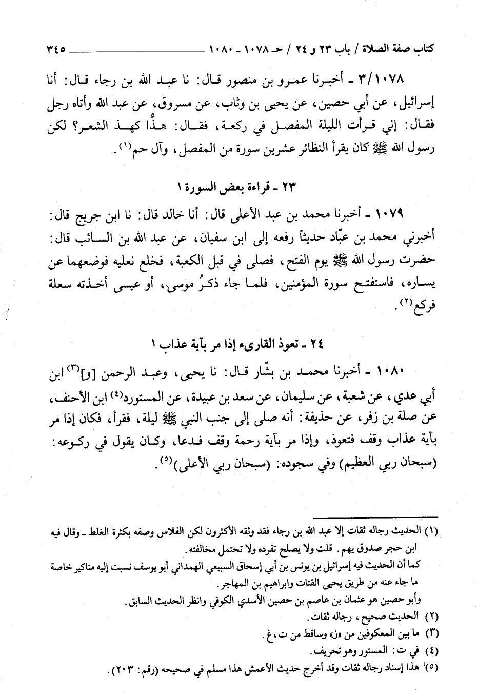 1080 - أخبرنا محمد بن بشار قال نا يحيى وعبد الرحمن وابن أبي عدي عن شعبة عن سليمان عن سعد بن عبيدة عن المستورد بن الأحنف عن صلة بن زفر عن حذيفة أنه : صلى إلى جنب النبي صلى الله عليه و سلم ليلة فقرأ فكان إذا مر بآية عذاب وقف فتعوذ وإذا مر بآية رحمة وقف فدعا وكان يقول في ركوعه سبحان ربي العظيم وفي سجوده سبحان ربي الأعلى