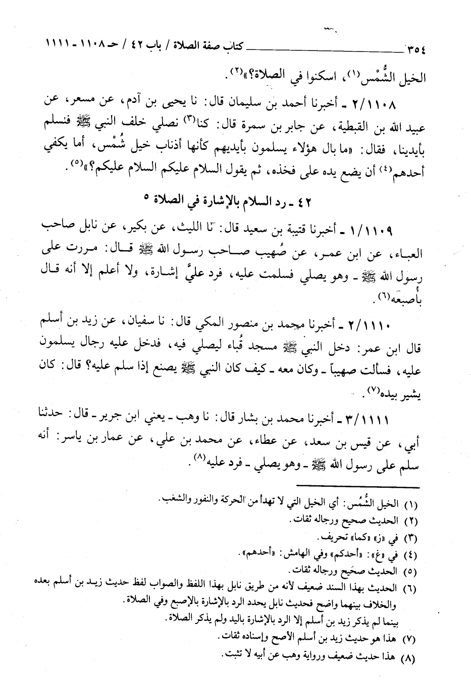 1108 - أخبرنا أحمد بن سليمان قال نا يحيى بن آدم عن مسعر عن عبيد الله بن القبطية عن جابر بن سمرة قال : كنا نصلي خلف النبي الله صلى الله عليه و سلم فنسلم بأيدينا فقال ما بال هؤلاء يسلمون بأيديهم كأنها أذناب خيل شمس أما يكفي أحدهم أن يضع يده على فخذه ثم يقول السلام عليكم السلام عليكم