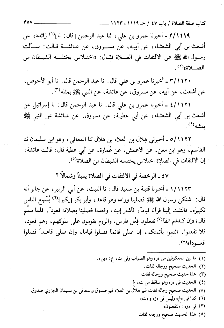 1119 - أخبرنا عمرو بن علي ثنا عبد الرحمن قال نا زائدة عن أشعث بن أبي الشعثاء عن أبيه عن مسروق عن عائشة قالت : سألت رسول الله صلى الله عليه و سلم عن الالتفات في الصلاة فقال اختلاس يختلسه الشيطان من الصلاة