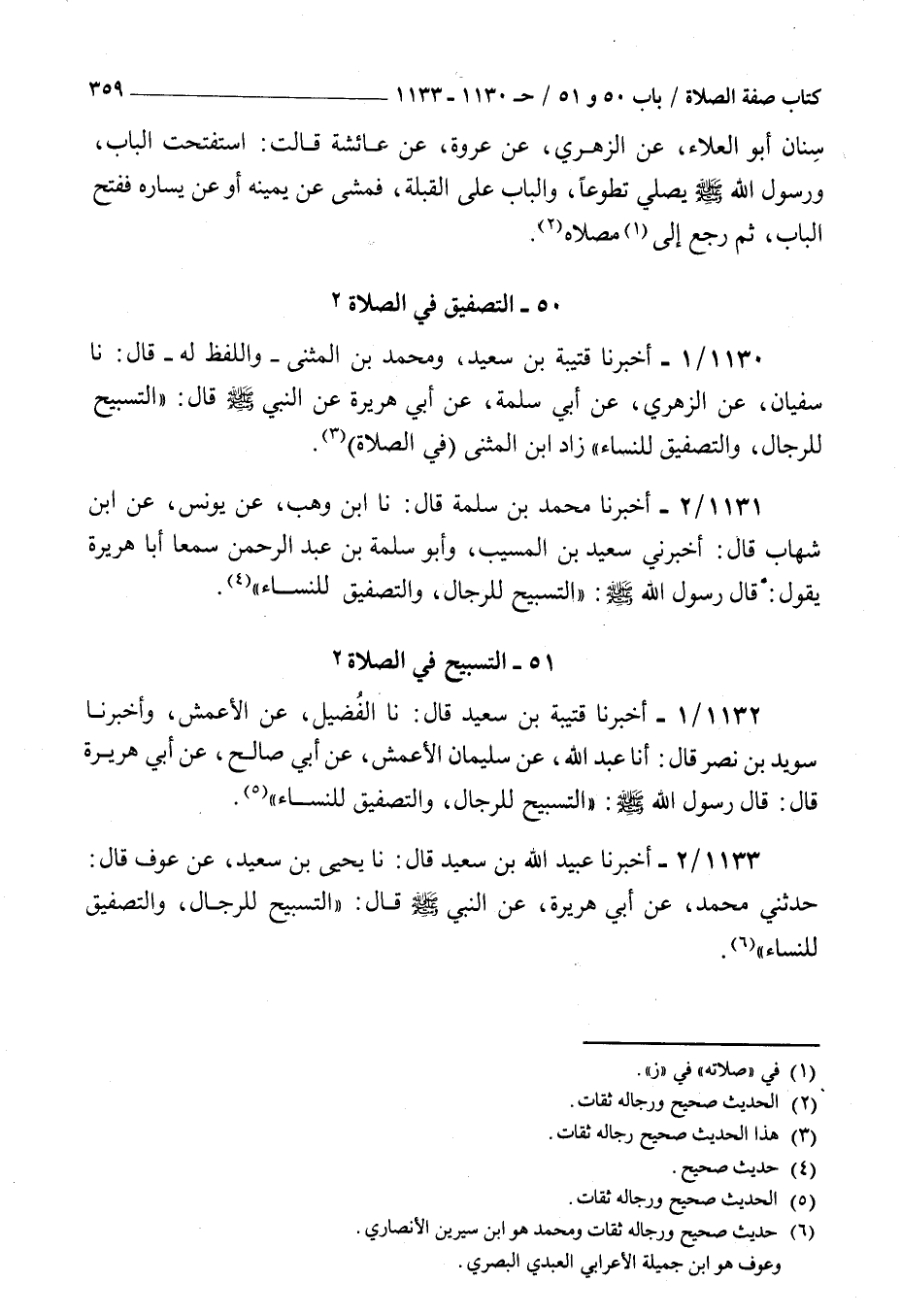 1130 - أخبرنا قتيبة بن سعيد ومحمد بن المثنى واللفظ له قال نا سفيان عن الزهري عن أبي سلمة عن أبي هريرة عن النبي صلى الله عليه و سلم قال : التسبيح للرجال والتصفيق للنساء زاد بن المثنى في الصلاة