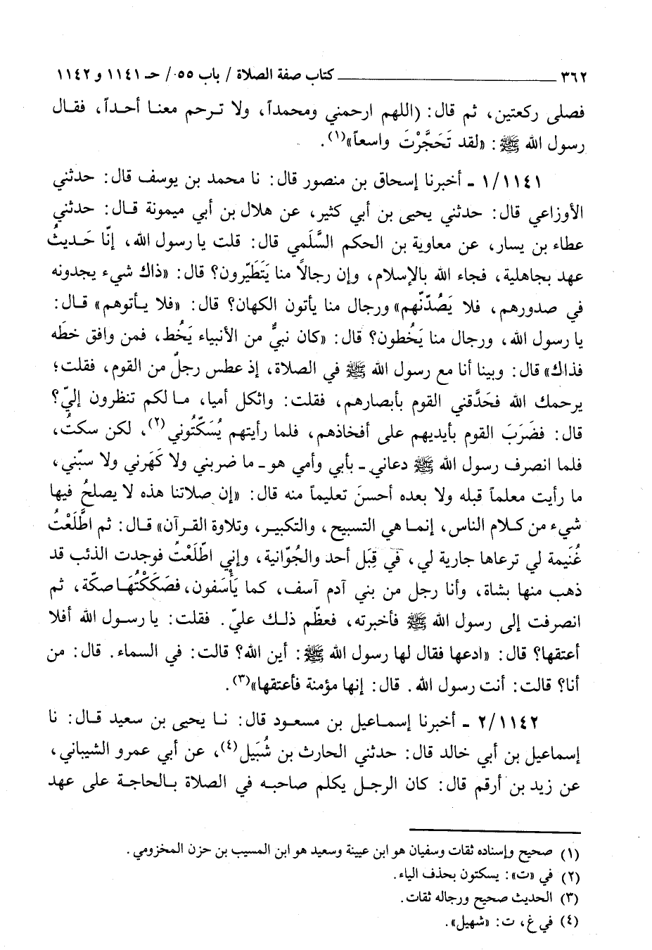1141 - أخبرنا إسحاق بن منصور قال نا محمد بن يوسف قال حدثني الأوزاعي قال حدثني يحيى بن أبي كثير عن هلال بن أبي ميمونة قال حدثني عطاء بن يسار عن معاوية بن الحكم السلمي قال قلت : يا رسول الله إنا حديث عهد بجاهلية فجاء الله بالإسلام وإن رجالا منا يتطيرون قال ذاك شيء يجدونه في صدورهم فلا يصدنهم ورجال منا يأتون الكهان قال فلا يأتوهم قال يا رسول الله ورجال منا يخطون قال كان نبي من الأنبياء يخط فمن وافق خطه فذاك قال وبينا أنا مع رسول الله صلى الله عليه و سلم في الصلاة إذ عطس رجل من القوم فقلت يرحمك الله فحدقني القوم بأبصارهم فقلت واثكل أميا ما لكم تنظرون إلي قال فضرب القوم بأيديهم على أفخاذهم فلما رأيتهم يسكتوني لكن سكت فلما انصرف رسول الله صلى الله عليه و سلم دعاني بأبي وأمي هو ما ضربني ولا كهرني ولا سبني ما رأيت معلما قبله ولا بعده أحسن تعليما منه قال إن صلاتنا هذه لا يصلح فيها شيء من كلام الناس إنما هي التسبيح والتكبير وتلاوة القرآن قال ثم اطلعت غنيمة لي ترعاها جارية لي في قبل أحد والجوانية وإني اطلعت فوجدت الذئب قد ذهب منها بشاة وأنا رجل من بني آدم آسف كما يأسفون فصككتها صكة ثم انصرفت إلى رسول الله صلى الله عليه و سلم فأخبرته فعظم ذلك علي فقلت يا رسول الله أفلا أعتقها قال ادعها فقال لها رسول الله صلى الله عليه و سلم أين الله قالت في السماء قال من أنا قالت أنت رسول الله قال إنها مؤمنة فأعتقها