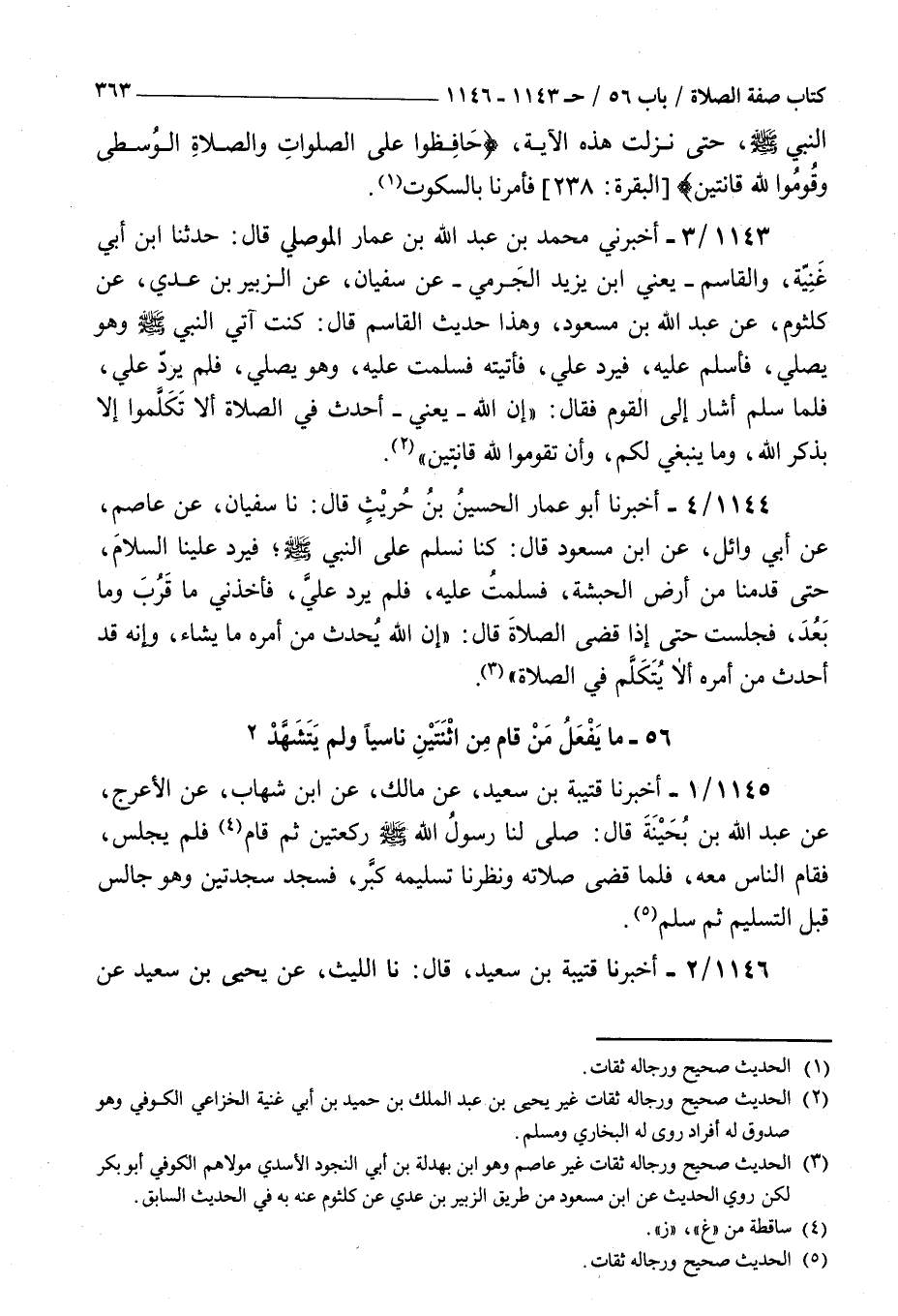 1144 - أخبرنا أبو عمار الحسين بن حريث قال نا سفيان عن عاصم عن أبي وائل عن بن مسعود قال : كنا نسلم على النبي صلى الله عليه و سلم فيرد علينا السلام حتى قدمنا من أرض الحبشة فسلمت عليه فلم يرد علي فأخذني ما قرب وما بعد فجلست حتى إذا قضى الصلاة قال إن الله يحدث من أمره ما يشاء وإنه قد أحدث من أمره ألا يتكلم في الصلاة