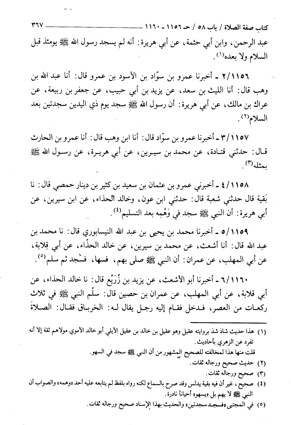 1158 - أخبرني عمرو بن عثمان بن سعيد بن كثير بن دينار حمصي قال نا بقية قال حدثني شعبة قال حدثني بن عون وخالد الحذاء عن بن سيرين عن أبي هريرة : أن النبي صلى الله عليه و سلم سجد في وهمه بعد التسليم