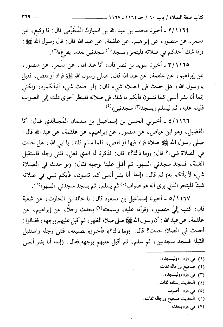 1164 - أخبرنا محمد بن عبد الله بن المبارك المخرمي قال نا وكيع عن مسعر عن منصور عن إبراهيم عن علقمة عن عبد الله قال قال رسول الله صلى الله عليه و سلم : إذا شك أحدكم في صلاته فليتحر ويسجد سجدتين بعدما يفرغ