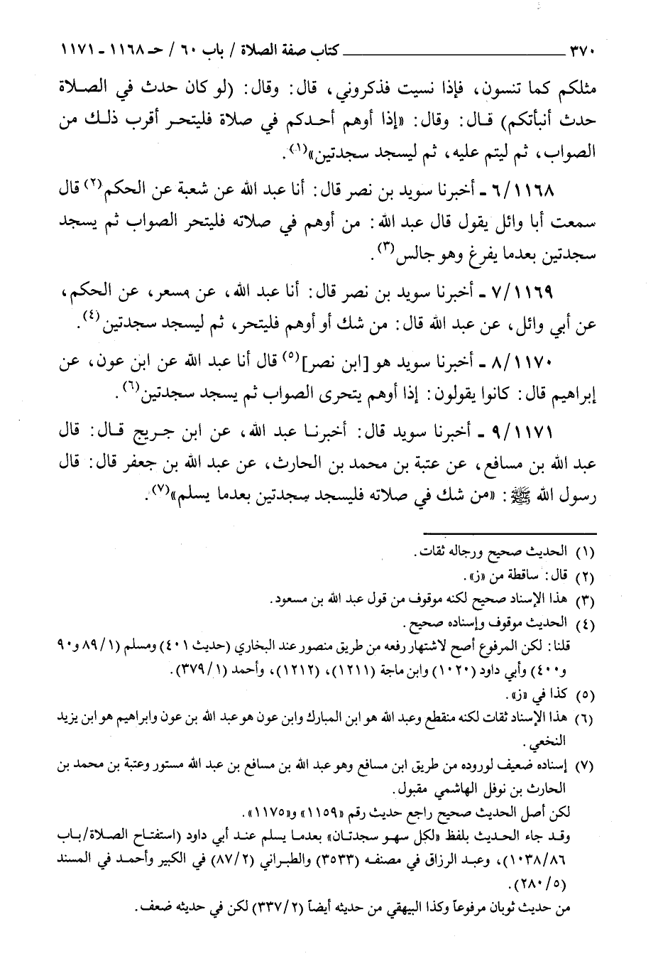 1168 - أخبرنا سويد بن نصر قال أنا عبد الله عن شعبة عن الحكم قال سمعت أبا وائل يقول قال عبد الله : من أوهم في صلاته فليتحر الصواب ثم يسجد سجدتين بعدما يفرغ وهو جالس
