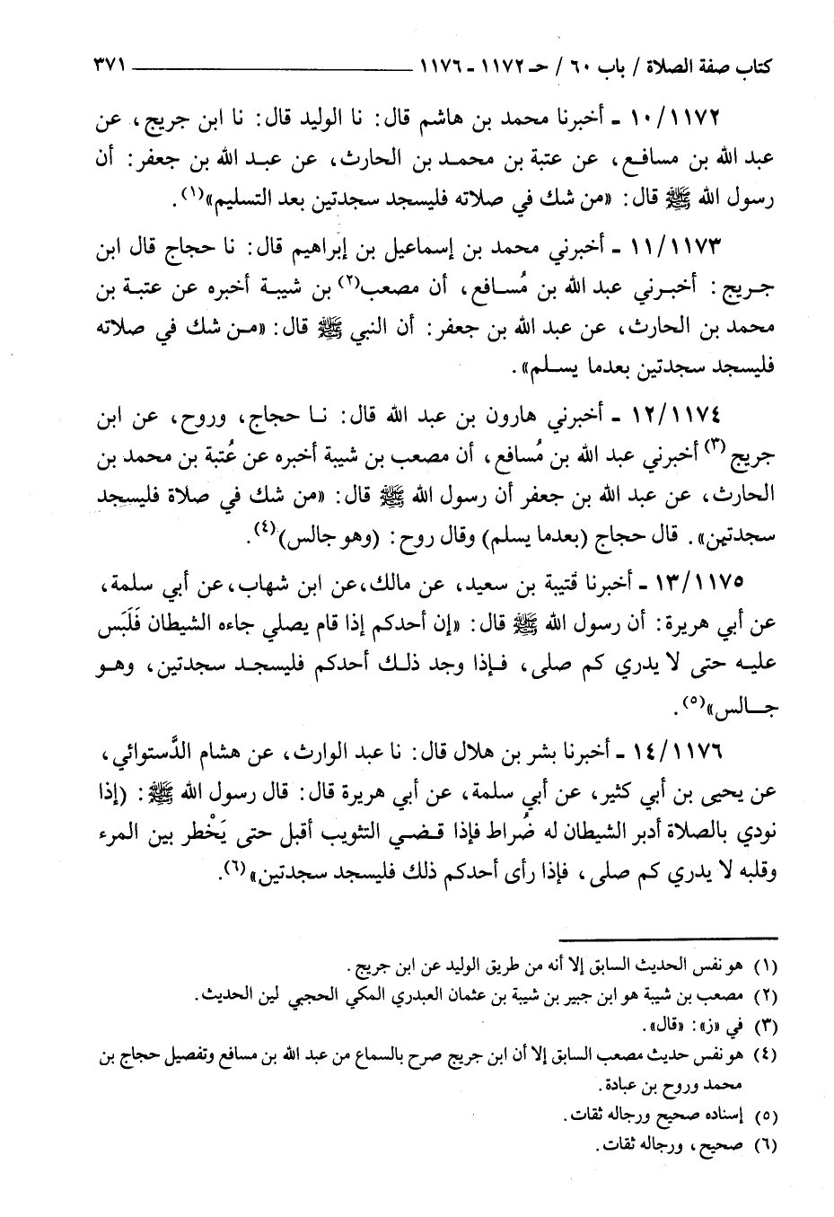 1174 - أخبرني هارون بن عبد الله قال نا حجاج وروح عن بن جريج أخبرني عبد الله بن مسافع أن مصعب بن شيبة أخبره عن عتبة بن محمد بن الحارث عن عبد الله بن جعفر أن رسول الله صلى الله عليه و سلم قال : من شك في صلاة فليسجد سجدتين قال حجاج بعدما يسلم وقال روح وهو جالس