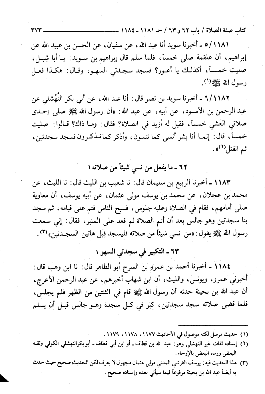 1181 - أخبرنا سويد أنا عبد الله عن سفيان عن الحسن بن عبيد الله عن إبراهيم أن علقمة صلى خمسا فلما سلم قال إبراهيم بن سويد : يا أبا شبل صليت خمسا أكذلك يا أعور فسجد سجدتي السهو وقال هكذا فعل رسول الله صلى الله عليه و سلم