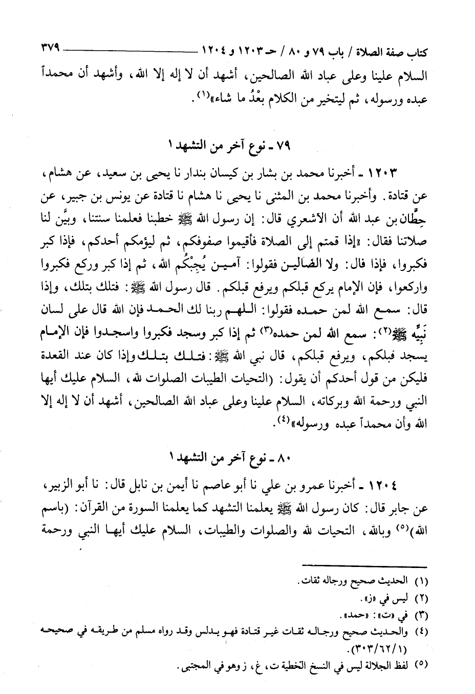 1204 - أخبرنا عمرو بن علي نا أبو عاصم نا أيمن بن نابل قال نا أبو الزبير عن جابر قال : كان رسول الله صلى الله عليه و سلم يعلمنا التشهد كما يعلمنا السورة من القرآن باسم الله وبالله التحيات لله والصلوات والطيبات السلام عليك أيها النبي ورحمة الله السلام علينا وعلى عباد الله الصالحين أشهد أن لا إله إلا الله وأن محمدا عبده ورسوله وأسأل الله الجنة وأعوذ بالله من النار