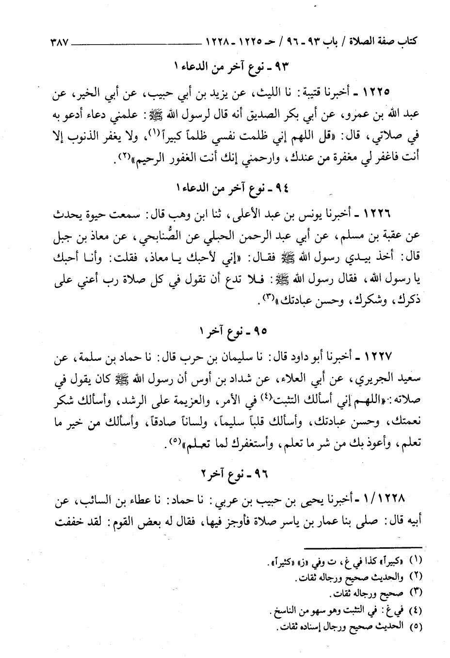 1227 - أخبرنا أبو داود قال نا سليمان بن حرب قال نا حماد بن سلمة عن سعيد الجريري عن أبي العلاء عن شداد بن أوس : أن رسول الله صلى الله عليه و سلم كان يقول في صلاته اللهم إني أسألك التثبت في الأمر والعزيمة على الرشد وأسألك شكر نعمتك وحسن عبادتك وأسألك قلبا سليما ولسانا صادقا وأسألك من خير ما تعلم وأعوذ بك من شر ما تعلم وأستغفرك لما تعلم