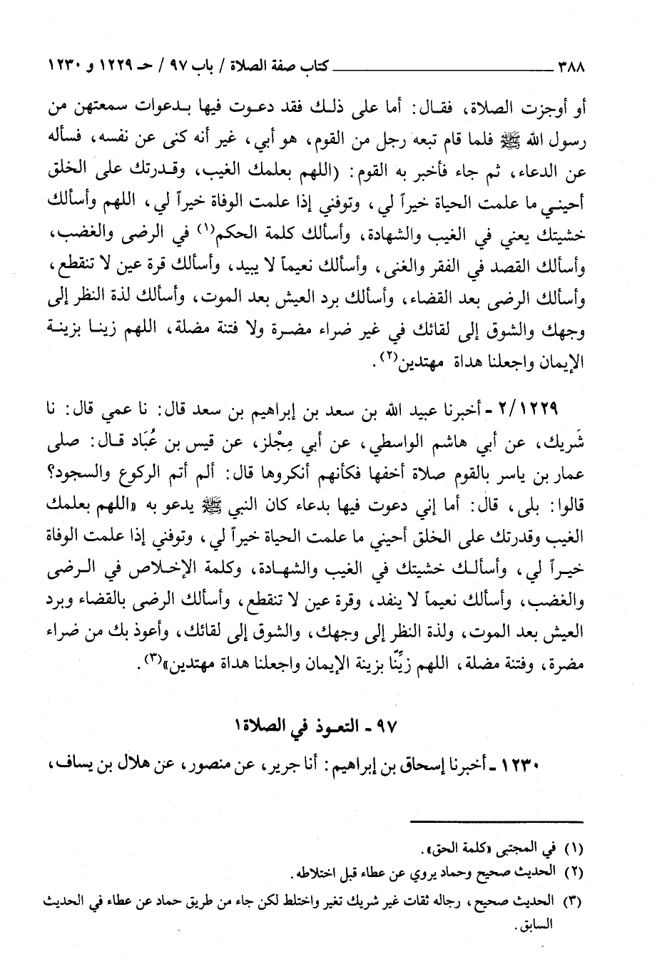 1229 - أخبرنا عبيد الله بن سعد بن إبراهيم بن سعد قال نا عمي قال نا شريك عن أبي هاشم الواسطي عن أبي مجلز عن قيس بن عباد قال : صلى عمار بن ياسر بالقوم صلاة أخفها فكأنهم أنكروها قال ألم أتم الركوع والسجود قالوا بلى قال أما إني دعوت فيها بدعاء كان النبي صلى الله عليه و سلم يدعو به اللهم بعلمك الغيب وقدرتك على الخلق أحيني ما علمت الحياة خيرا لي وتوفني إذا علمت الوفاة خيرا لي وأسألك خشيتك في الغيب والشهادة وكلمة الإخلاص في الرضى والغضب وأسألك نعيما لا ينفد وقرة عين لا تنقطع وأسألك الرضى بالقضاء وبرد العيش بعد الموت ولذة النظر إلى وجهك والشوق إلى لقائك وأعوذ بك من ضراء مضرة وفتنة مضلة اللهم زينا بزينة الإيمان واجعلنا هداة مهتدين
