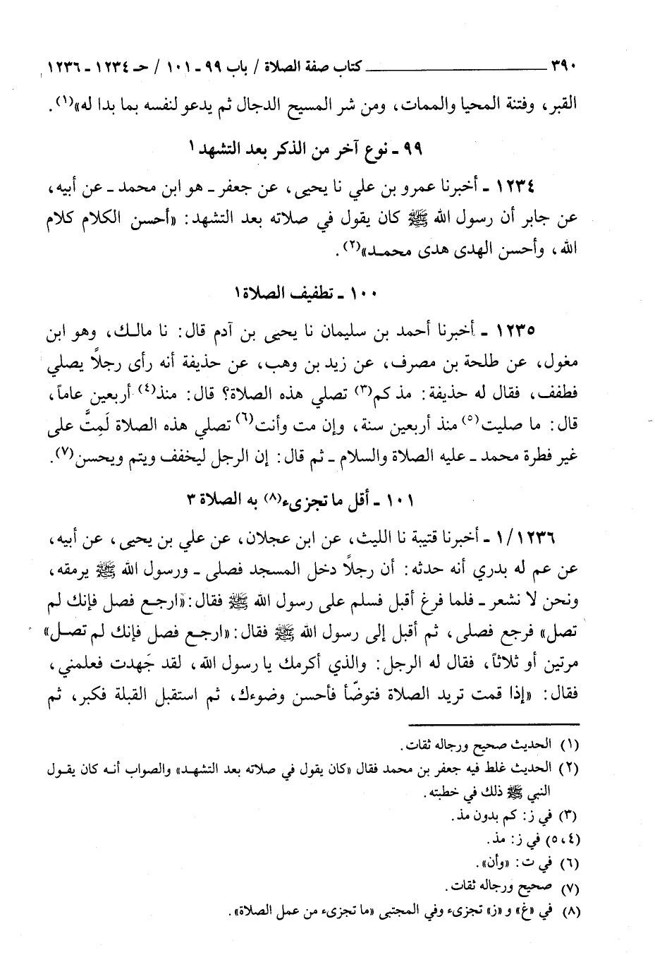 1235 - أخبرنا أحمد بن سليمان نا يحيى بن آدم قال نا مالك وهو بن مغول عن طلحة بن مصرف عن زيد بن وهب عن حذيفة : أنه رأى رجلا يصلي فطفف فقال له حذيفة مذكم تصلي هذه الصلاة قال منذ أربعين عاما قال ما صليت منذ أربعين سنة وإن مت وأنت تصلي هذه الصلاة لمت على غير فطرة محمد صلى الله عليه و سلم ثم قال إن الرجل ليخفف ويتم ويحسن