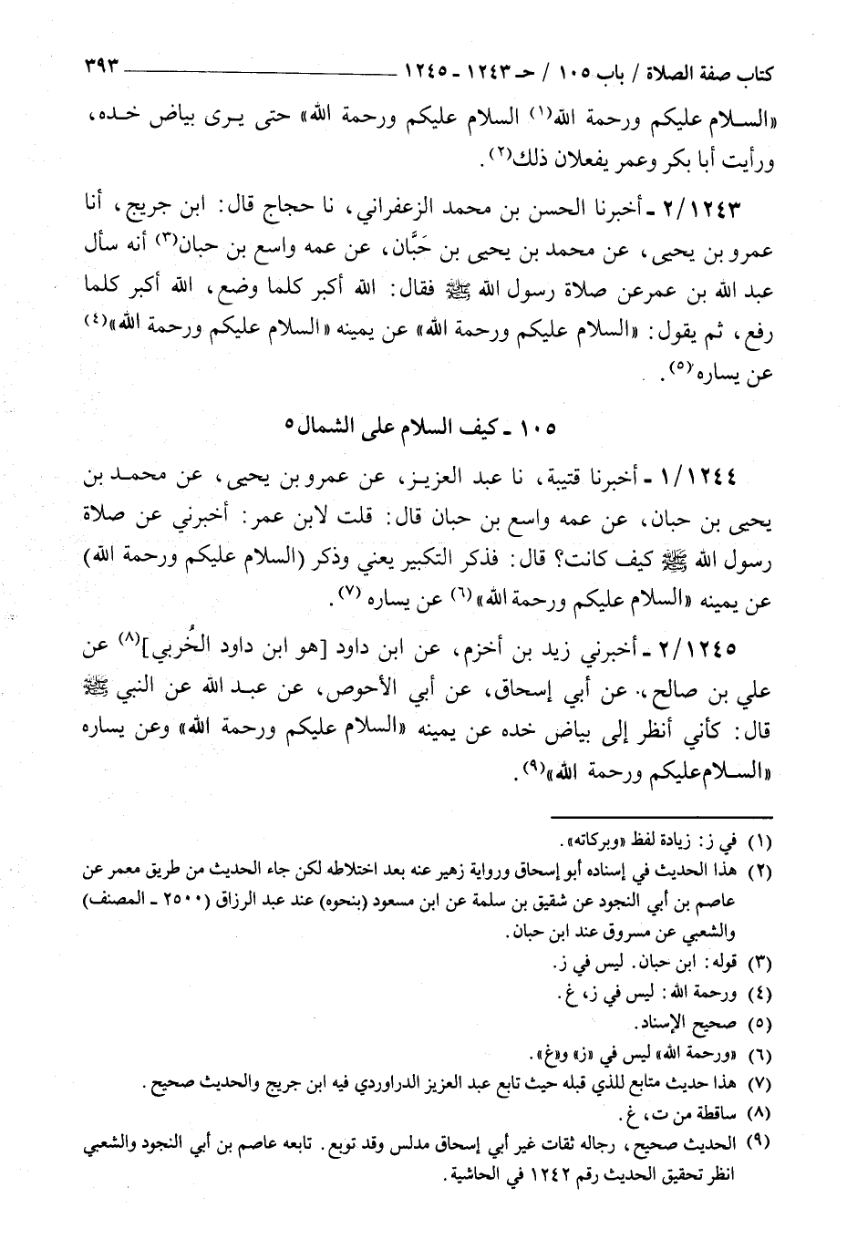 1245 - أخبرني زيد بن أخزم عن بن داود هو بن داود الخربي عن علي بن صالح عن أبي إسحاق عن أبي الأحوص عن عبد الله عن النبي صلى الله عليه و سلم قال : كأني أنظر إلى بياض خده عن يمينه السلام عليكم ورحمة الله وعن يساره السلام عليكم ورحمة الله