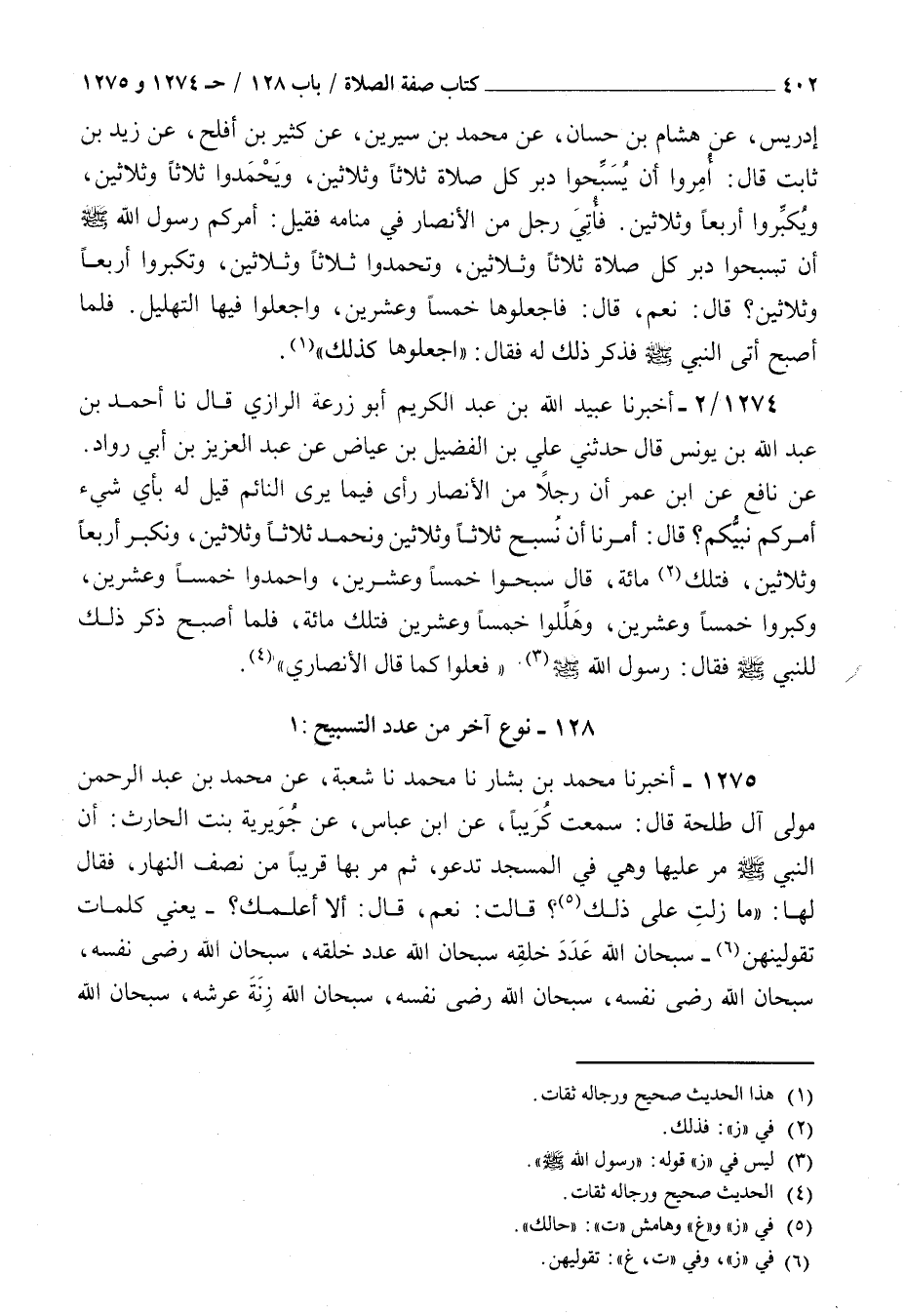 1274 - أخبرنا عبيد الله بن عبد الكريم أبو زرعة الرازي قال نا أحمد بن عبد الله بن يونس قال حدثني علي بن الفضيل بن عياض عن عبد العزيز بن أبي رواد عن نافع عن بن عمر : أن رجلا من الأنصار رأى فيما يرى النائم قيل له بأي شيء أمركم نبيكم قال أمرنا أن نسبح ثلاثا وثلاثين ونحمد ثلاثا وثلاثين ونكبر أربعا وثلاثين فتلك مائة قال سبحوا خمسا وعشرين واحمدوا خمسا وعشرين وكبروا خمسا وعشرين وهللوا خمسا وعشرين فتلك مائة فلما أصبح ذكر ذلك للنبي صلى الله عليه و سلم فقال رسول الله صلى الله عليه و سلم فعلوا كما قال الأنصاري