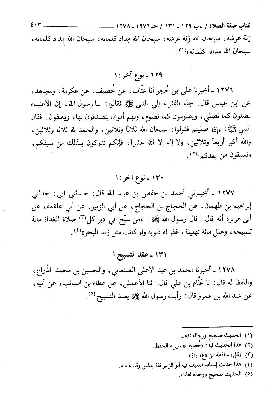 1276 - أخبرنا علي بن حجر أنا عتاب عن خصيف عن عكرمة ومجاهد عن بن عباس قال جاء الفقراء إلى النبي صلى الله عليه و سلم فقالوا : يا رسول الله إن الأغنياء يصلون كما نصلي ويصومون كما نصوم ولهم أموال يتصدقون بها ويعتقون فقال النبي صلى الله عليه و سلم إذا صليتم فقولوا سبحان الله ثلاثا وثلاثين والحمد لله ثلاثا وثلاثين والله أكبر أربعا وثلاثين ولا إله إلا الله عشرا فإنكم تدركون بذلك من سبقكم وتسبقون من بعدكم