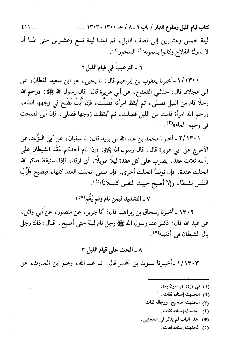1302 - أخبرنا إسحاق بن إبراهيم قال أنا جرير عن منصور عن أبي وائل عن عبد الله قال : ذكر عند رسول الله صلى الله عليه و سلم رجل نام ليلة حتى أصبح قال ذاك رجل بال الشيطان في أذنيه