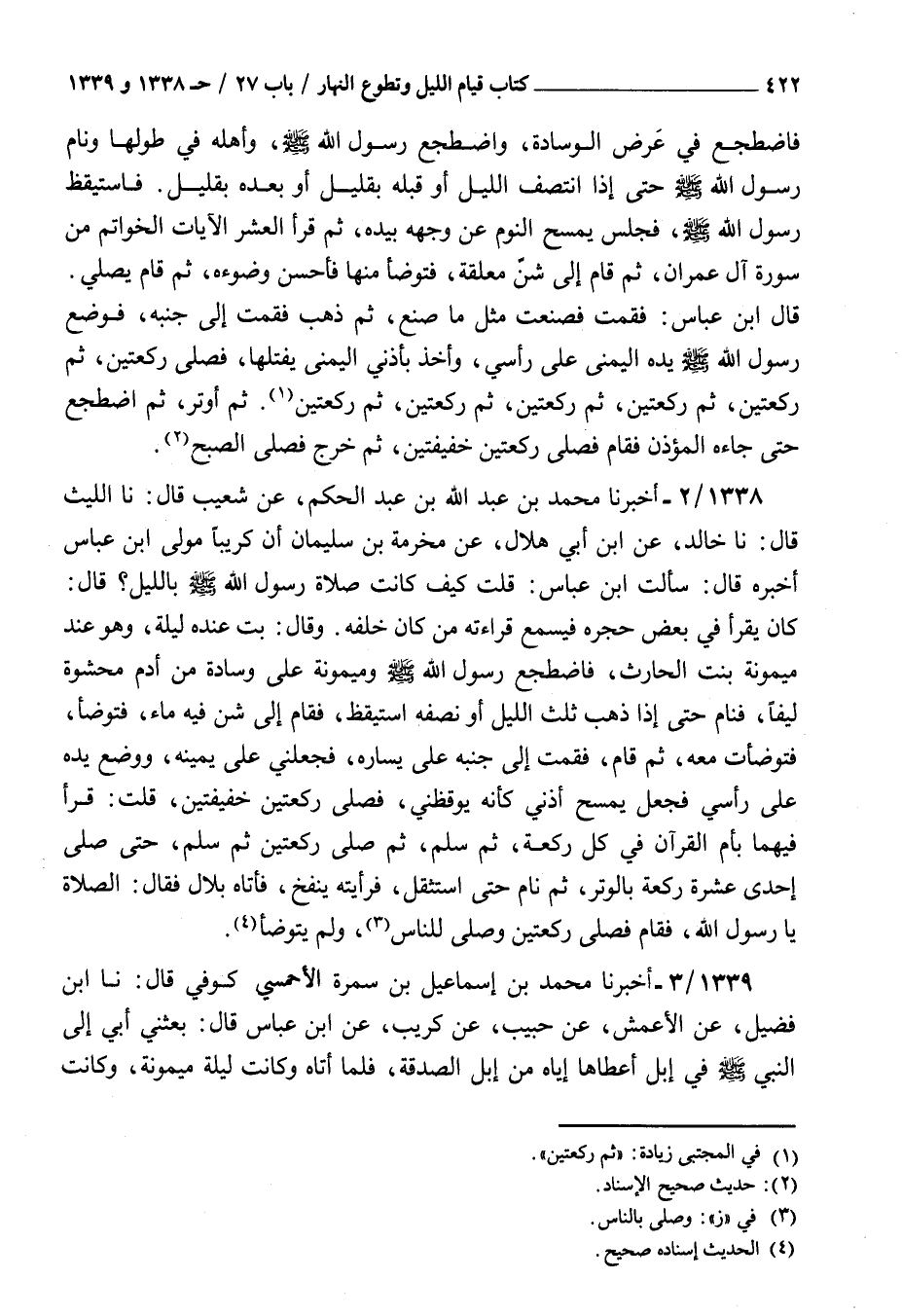 1339 - أخبرنا محمد بن إسماعيل بن سمرة الأحمسي كوفي قال نا بن فضيل عن الأعمش عن حبيب عن كريب عن بن عباس قال : بعثني أبي إلى النبي صلى الله عليه و سلم في إبل أعطاها إياه من إبل الصدقة فلما أتاه وكانت ليلة ميمونة وكانت ميمونة خالة بن عباس فأتى المسجد فصلى العشاء ثم جاء فطرح ثوبه ثم دخل مع امرأته في ثيابها فأخذت ثوبي فجعلت أطويه تحتي ثم اضطجعت عليه ثم قال لا أنام الليلة حتى أنظر إلى ما يصنع رسول الله صلى الله عليه و سلم فنام حتى نفخ حتى ذهب من الليل ما شاء الله أن يذهب ثم قام فخرج فبال ثم أتى سقاء موكأ فحل وكاءه ثم صب على يديه من الماء ثم وطئ على فم السقاء فجعل يغسل يديه ثم توضأ حتى فرغ وأردت أن أقوم فأصب عليه فخفت أن يدع الليل من أجلي ثم قام يصلي فقمت ففعلت مثل الذي فعل ثم أتيته فقمت عن يساره فتناولني بيده فأقامني عن يمينه فصلى ثلاث عشرة ركعة ثم اضطجع حتى جاءه بلال فأذن بالصلاة فقام فصلى ركعتين قبل الفجر خالفه سعيد بن جبير