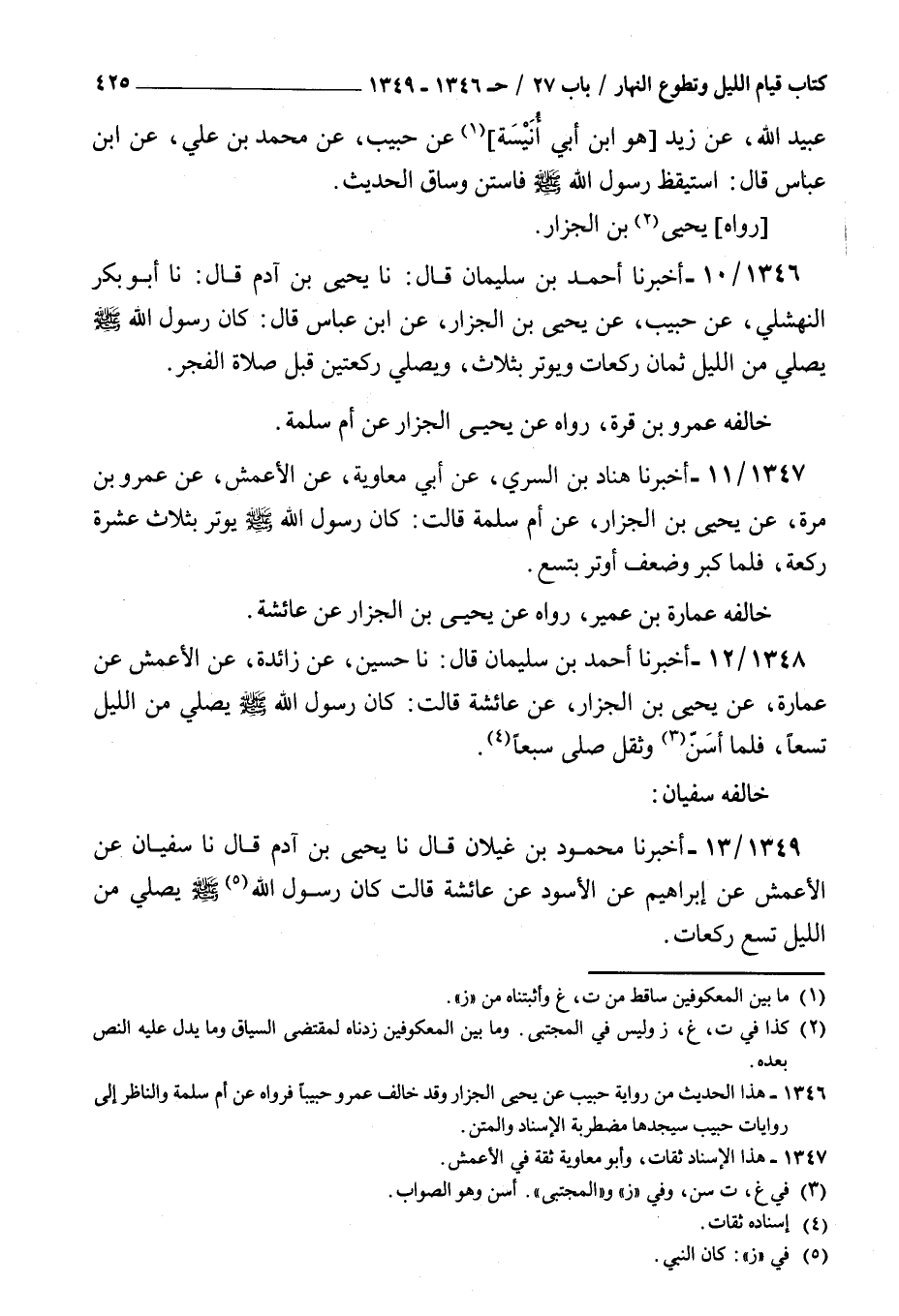 1349 - أخبرنا محمود بن غيلان قال نا يحيى بن آدم قال نا سفيان عن الأعمش عن إبراهيم عن الأسود عن عائشة قالت : كان رسول الله صلى الله عليه و سلم يصلي من الليل تسع ركعات قال أبو عبد الرحمن روى أبو الأحوص سلام بن سليم الحديثين جميعا