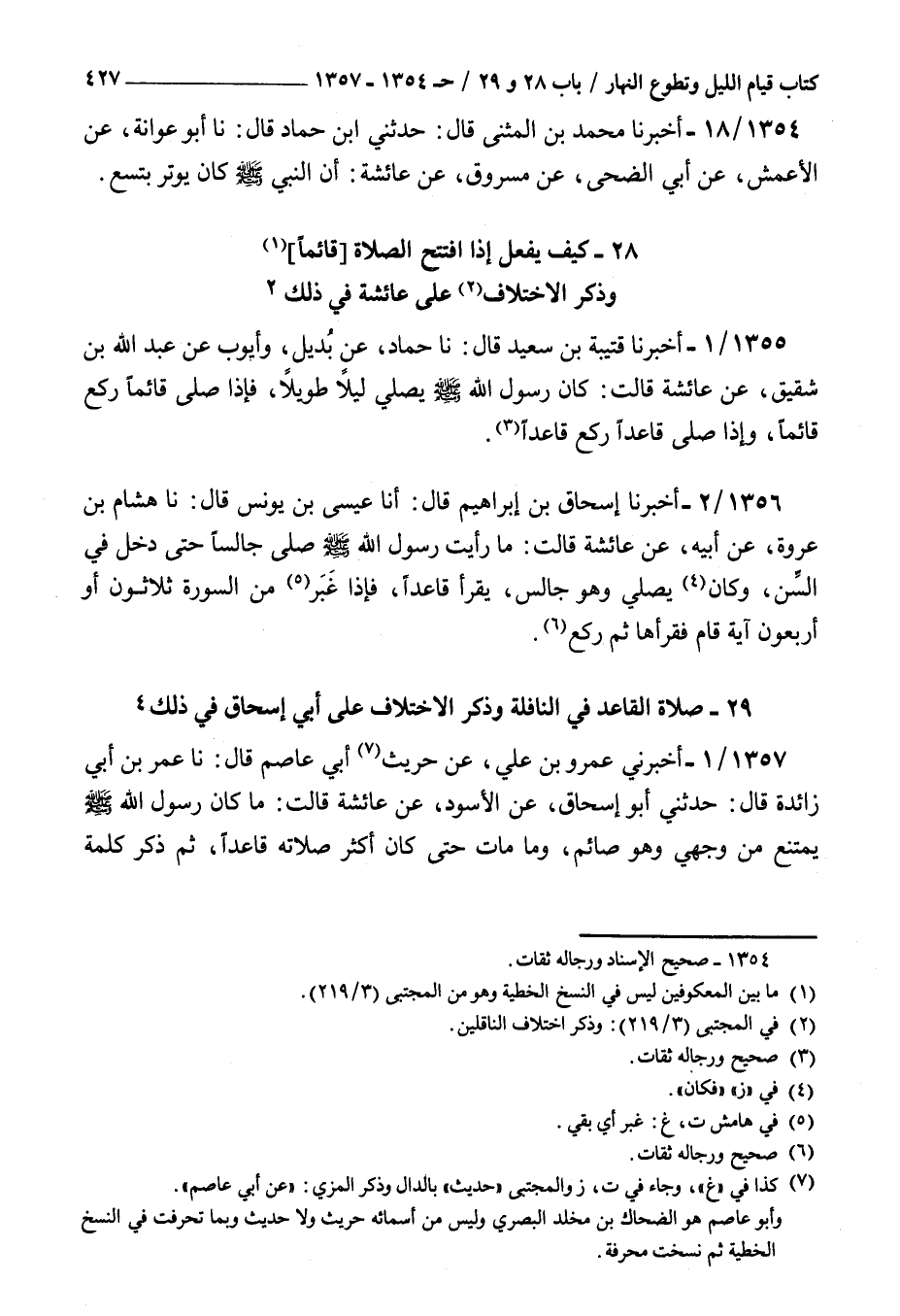 1355 - أخبرنا قتيبة بن سعيد قال نا حماد عن بديل وأيوب عن عبد الله بن شقيق عن عائشة قالت : كان رسول الله صلى الله عليه و سلم يصلي ليلا طويلا فإذا صلى قائما ركع قائما وإذا صلى قاعدا ركع قاعدا