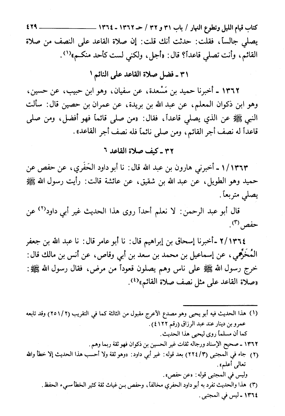1363 - أخبرني هارون بن عبد الله قال نا أبو داود الحفري عن حفص عن حميد وهو الطويل عن عبد الله بن شقيق عن عائشة قالت : رأيت رسول الله صلى الله عليه و سلم يصلي متربعا قال أبو عبد الرحمن لا نعلم أحدا روى هذا الحديث غير أبي داود عن حفص
